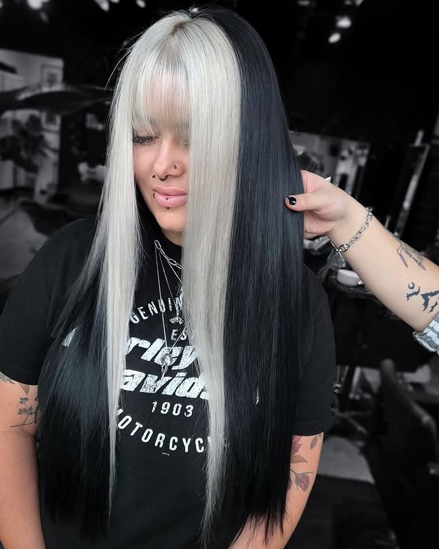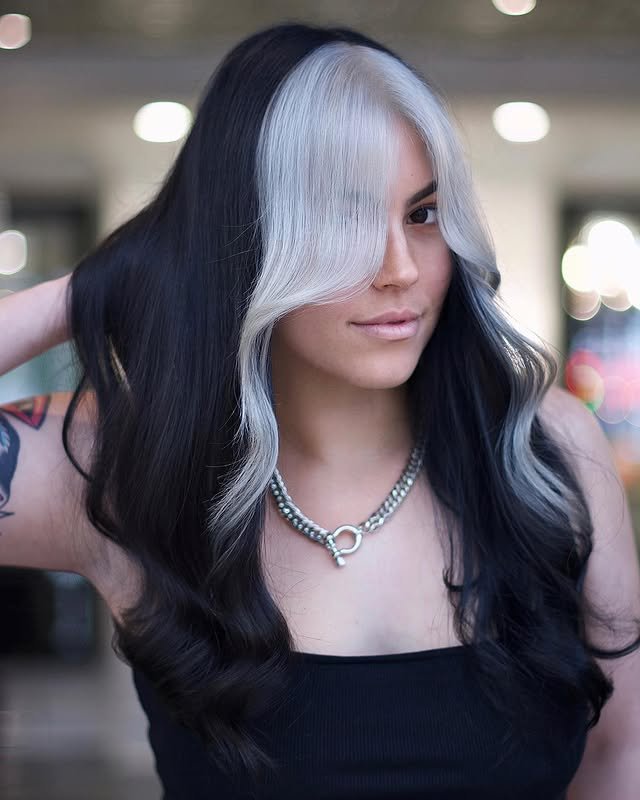 For a statement look, split dye black and white hair is a daring choice. Half black and half white, this hairstyle is edgy and artistic. It’s perfect for those who want their hair to be a true fashion statement.