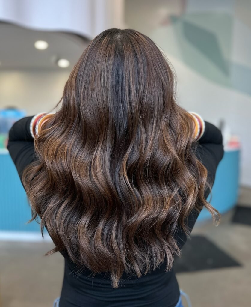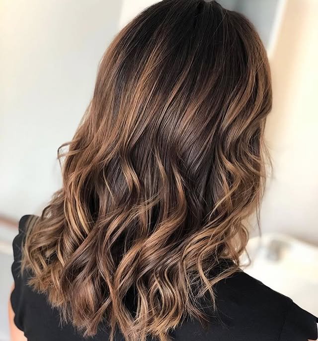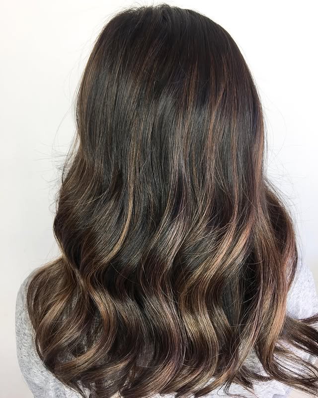 Mix caramel highlights with lowlights for a dimensional effect. This balance adds richness and natural depth to dark hair.