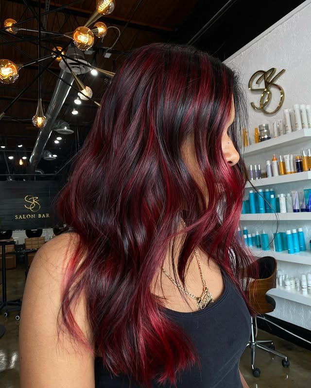 Balayage and highlights in cherry coke tones add stunning depth. The layered hues create a multidimensional effect that looks natural yet bold. These gorgeous ideas are full of movement and shine.