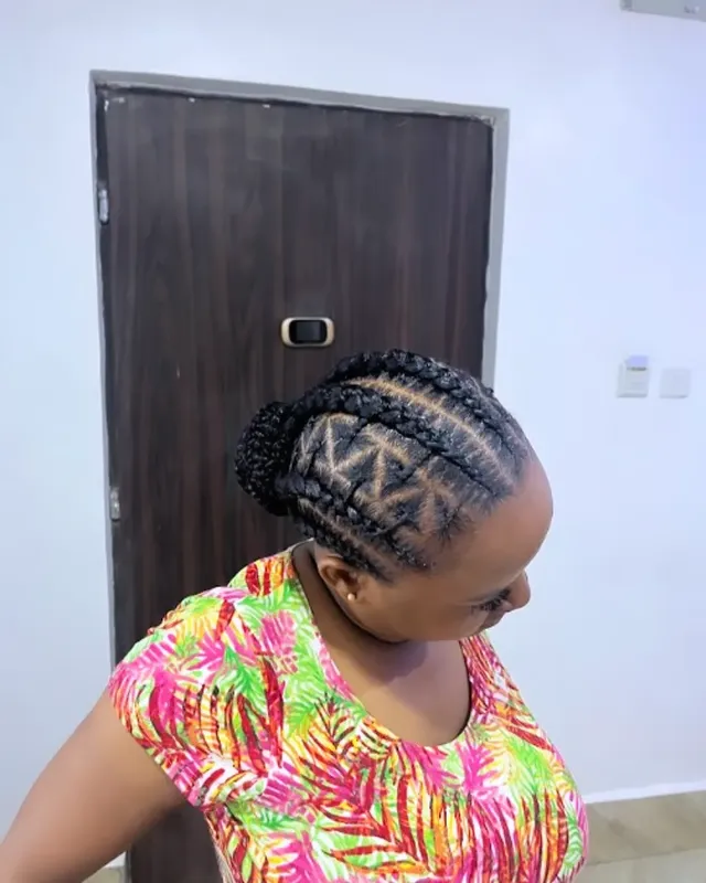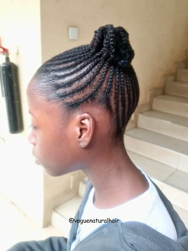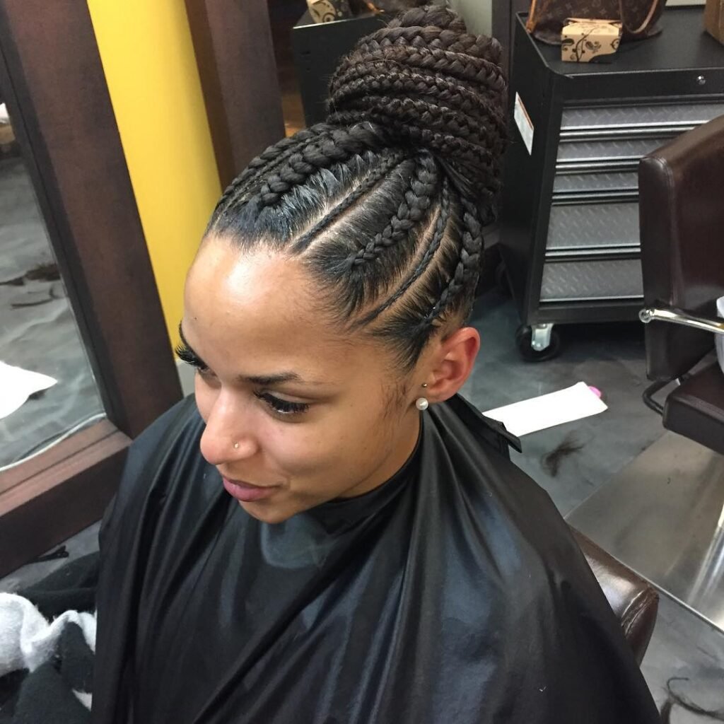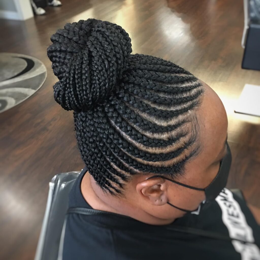 If you love understated elegance, this low cornrow bun is your match. It’s simple, comfortable, and incredibly stylish. Whether you’re dressing up or keeping it casual, this hairstyle exudes quiet confidence and natural beauty.