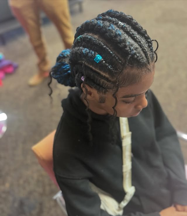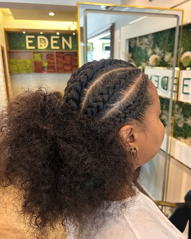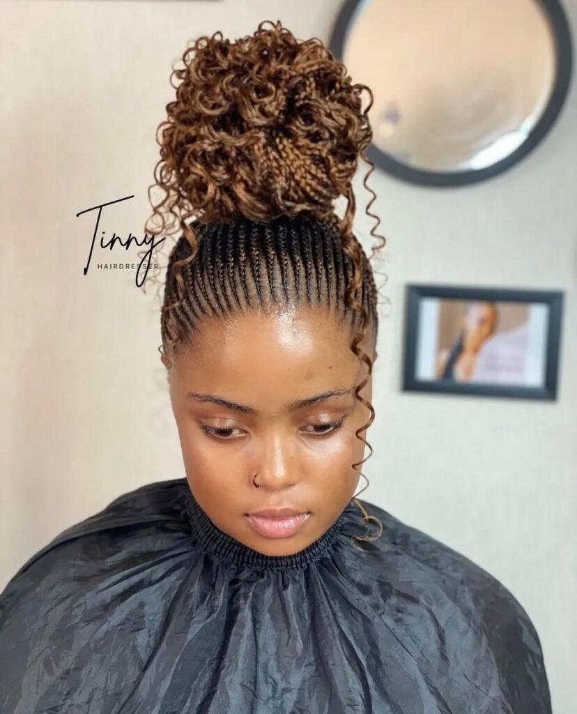 Mix texture and style with cornrows that flow into curly ends. The bun keeps things neat, while the curls add a fun, carefree vibe. It’s a stunning combo for anyone who loves versatility and playfulness.