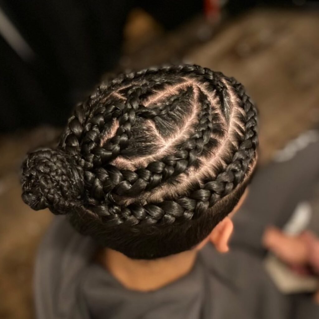 For a neat and refined appearance, try a small cornrow bun. The compact braids create a smooth, polished effect that’s perfect for professional settings or minimalist fashion lovers. Clean, classy, and always in style.