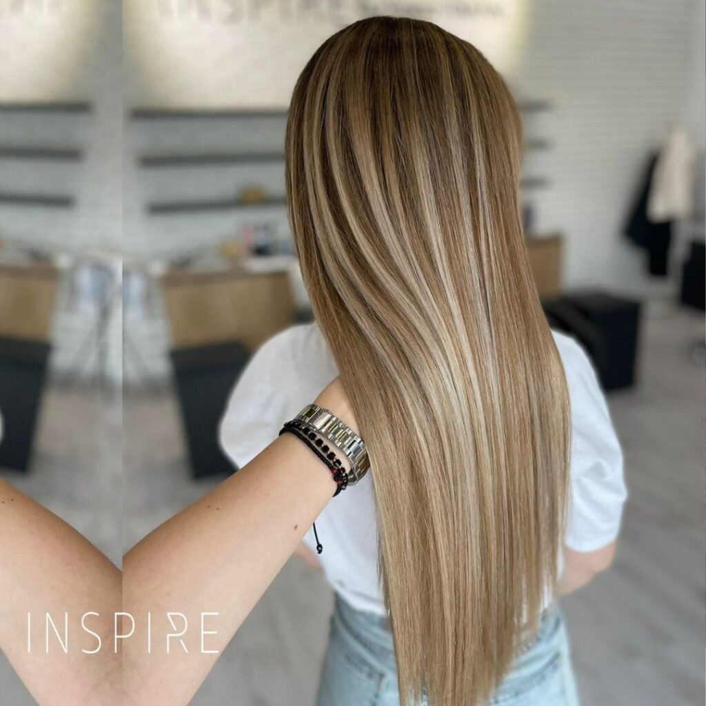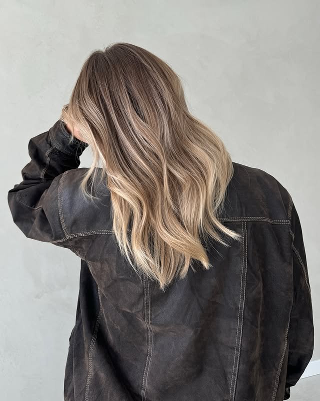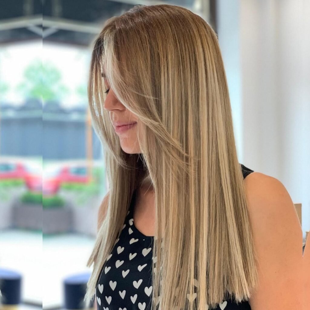 Balayage blonde highlights on light brown hair create a soft and natural transition. It’s a low-maintenance style that grows out beautifully.