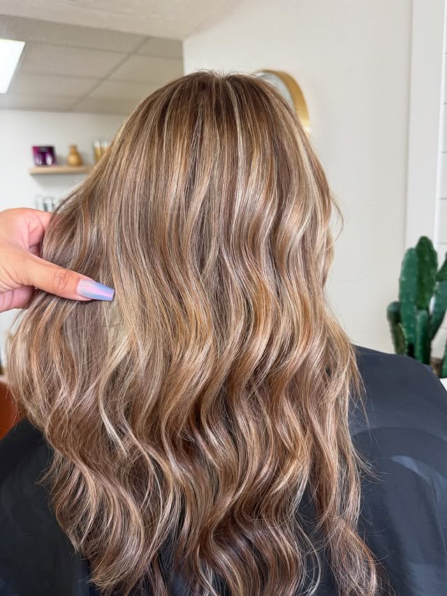 Caramel blonde highlights create warmth and dimension on light brown hair. A sweet and flattering mix that feels fresh and feminine.