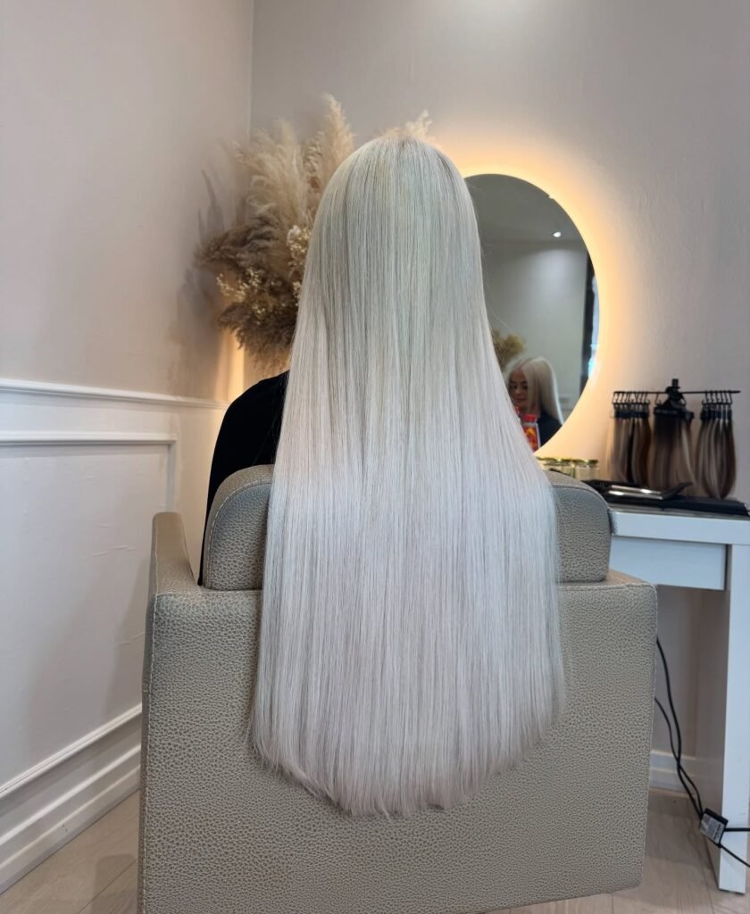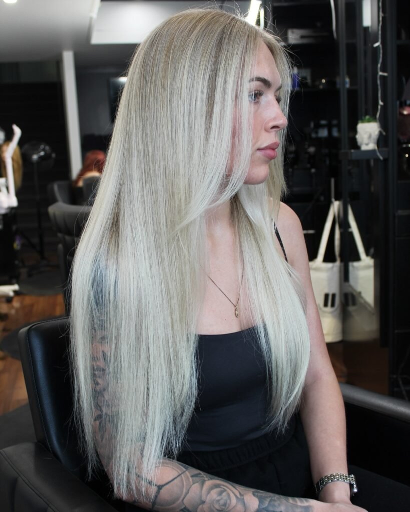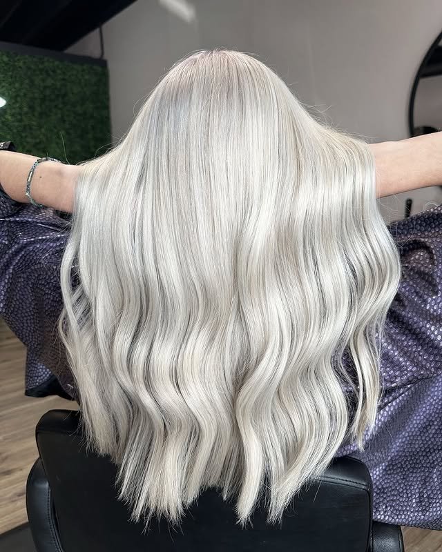 Straight platinum blonde hair gives a glass-like shine. It’s chic, smooth, and timelessly fashionable.