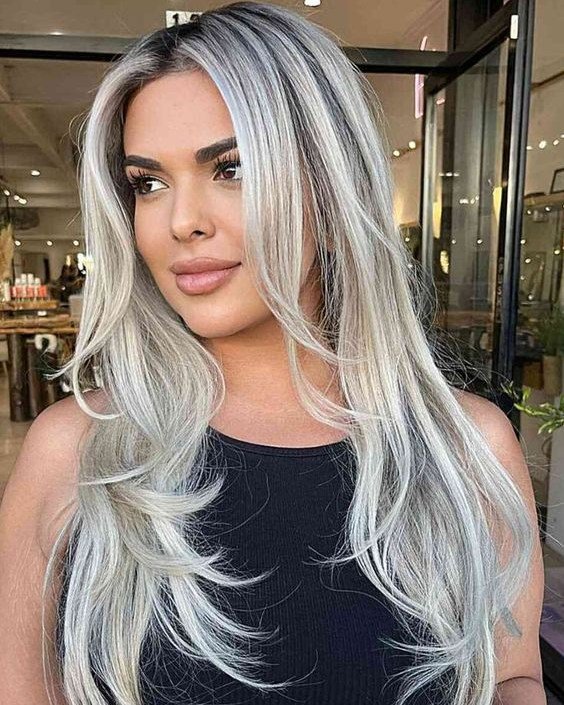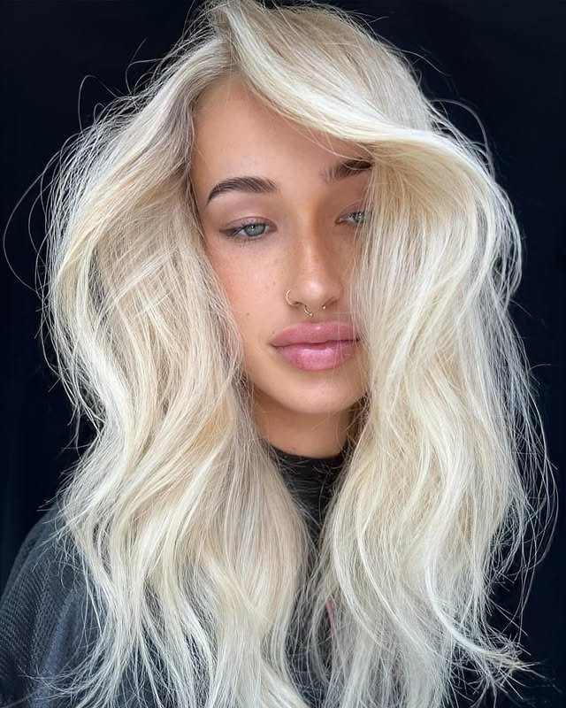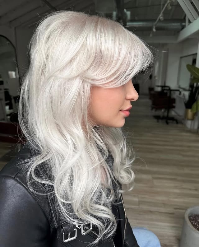 Layered platinum blonde hair brings movement and shine. It’s an ideal choice for those who love flowy, textured styles.