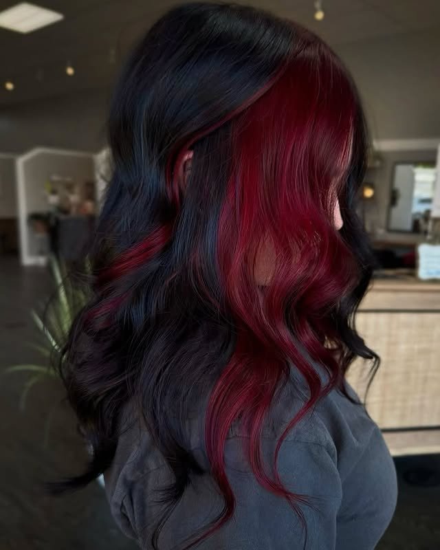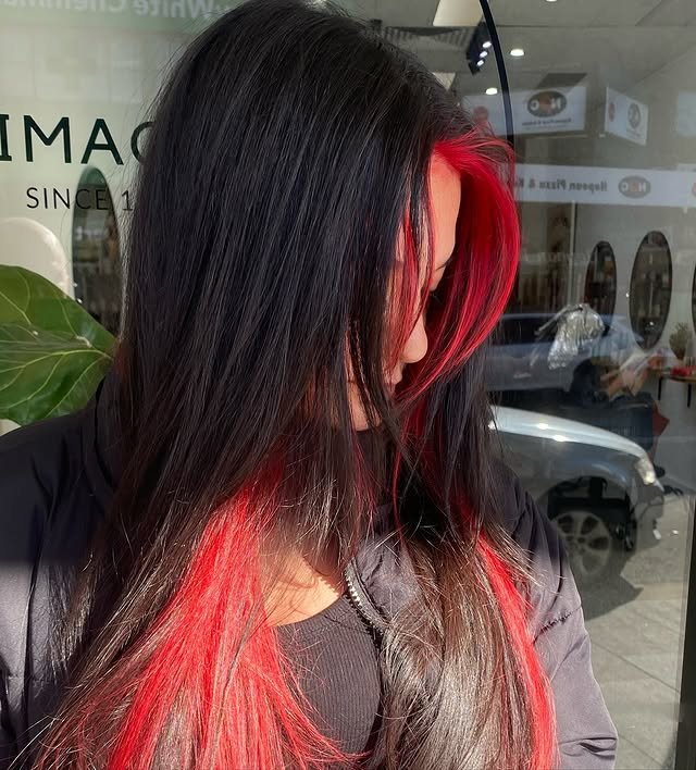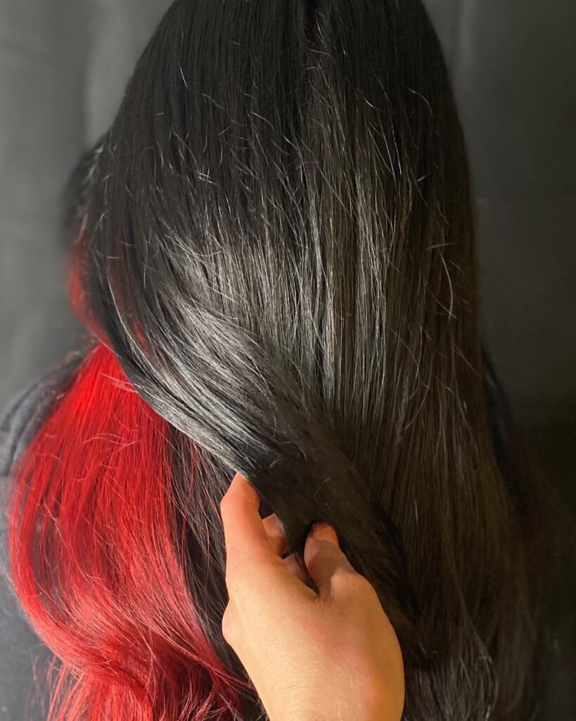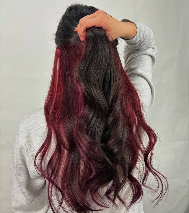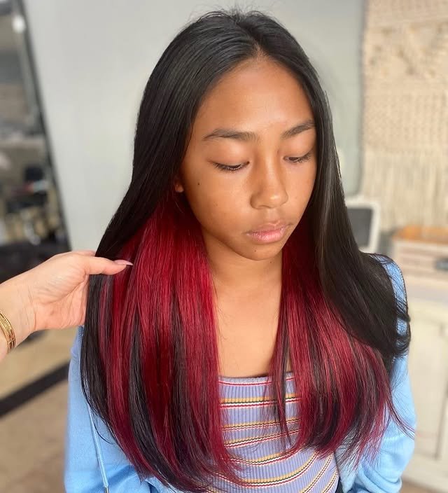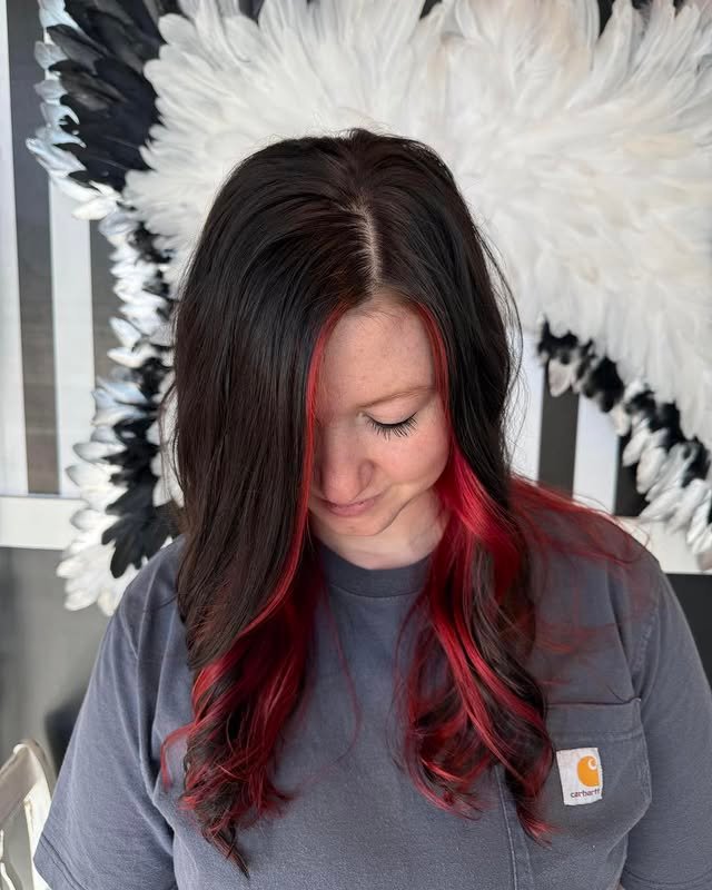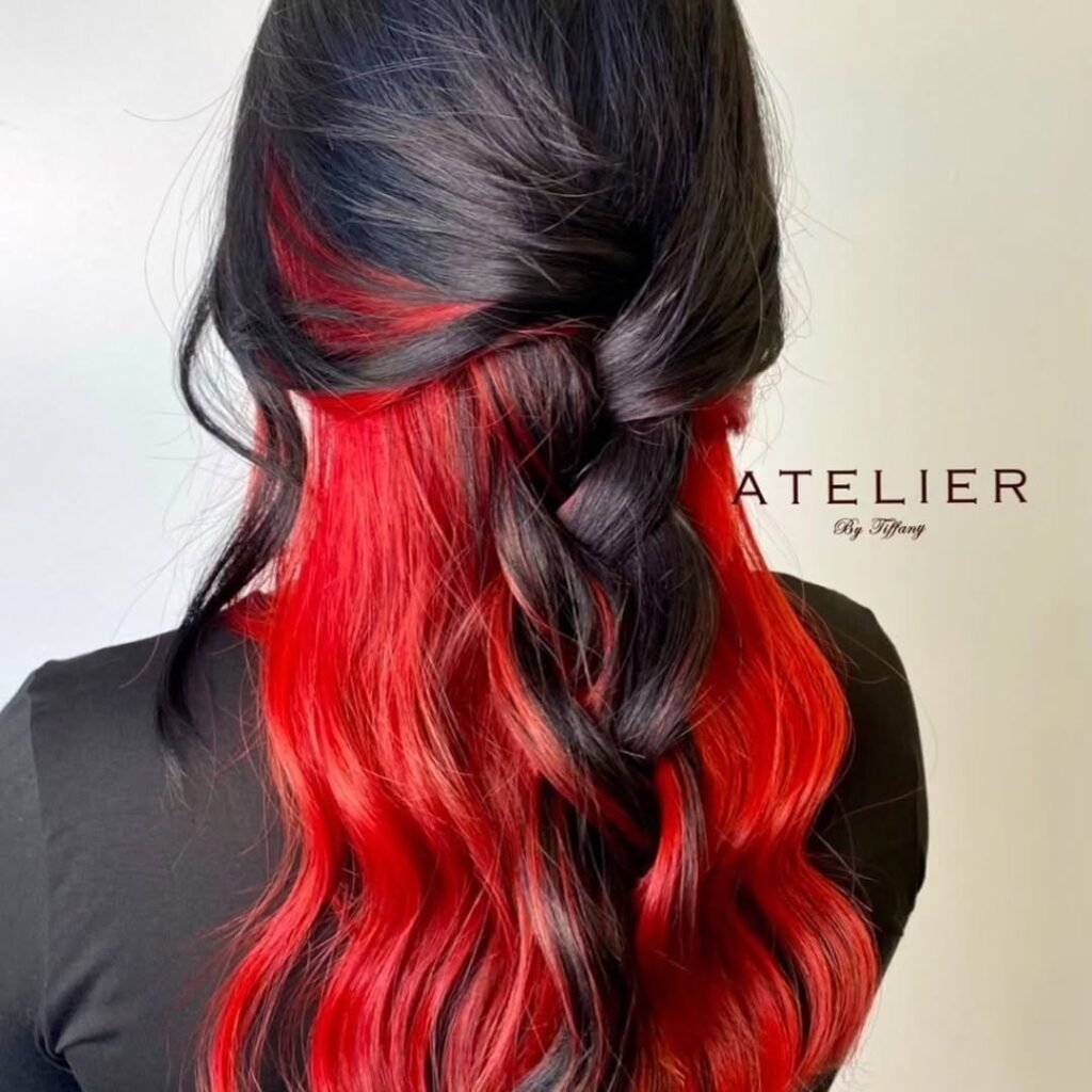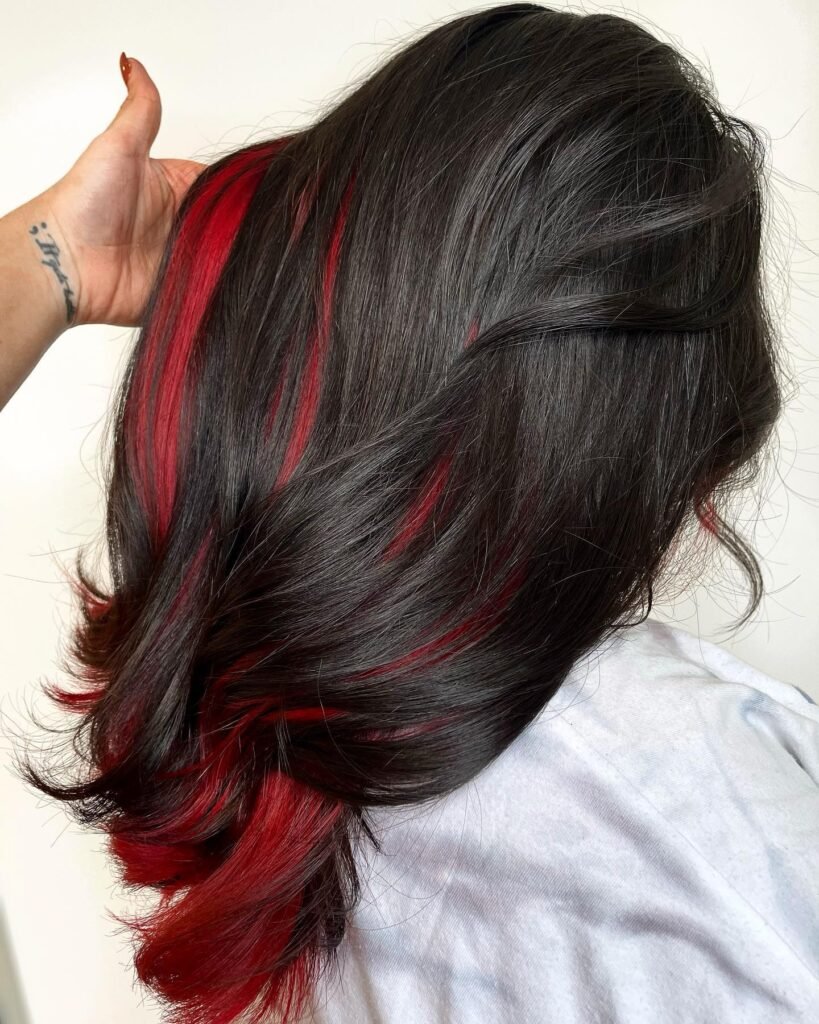 Red against darker hair is striking and fearless. Peekaboo highlights let you keep it subtle while still making a statement. These bold styles are perfect for confident, head-turning looks.