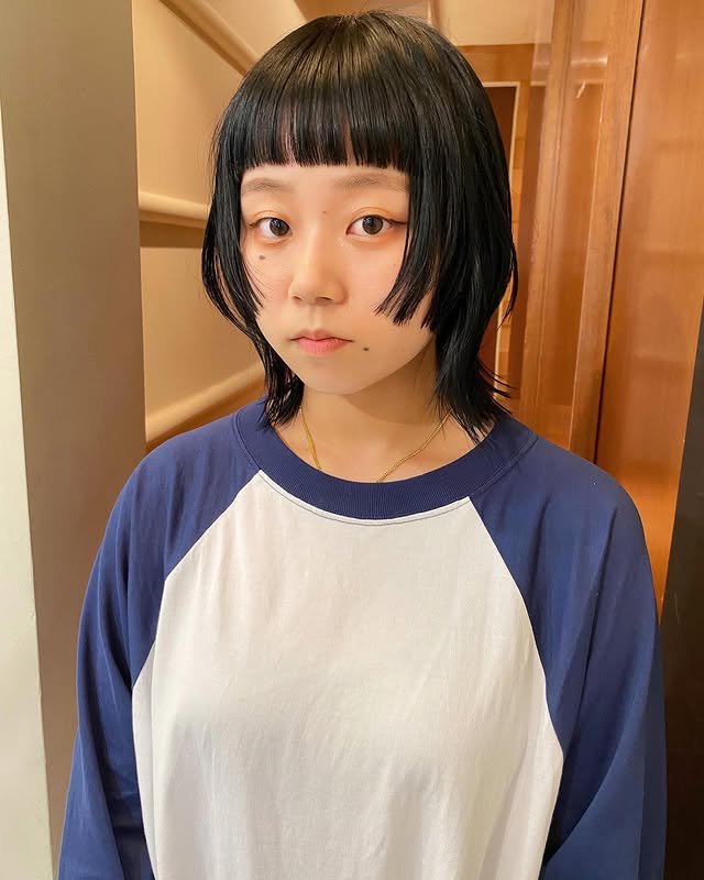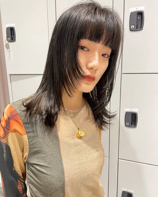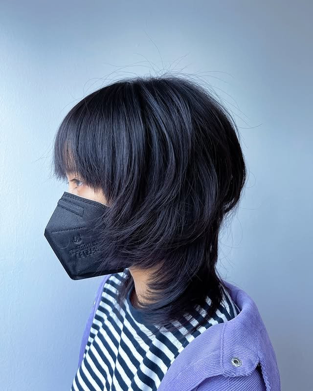 Blunt bangs add a bold front to this sleek black wolf hairstyle. The strong fringe pairs perfectly with the layered body, giving off confident, fashion-forward energy.