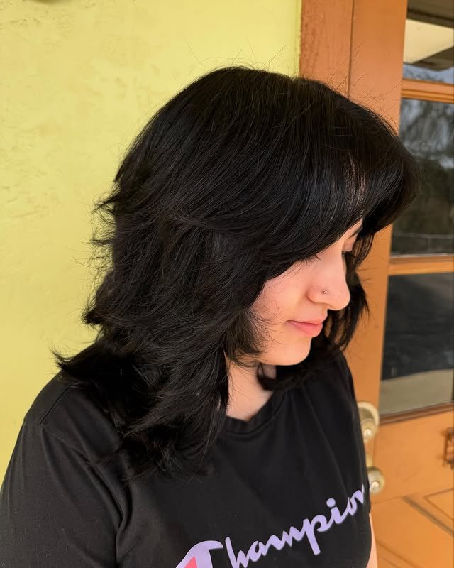 Side bangs bring a touch of elegance to this medium-length black wolf hair. The soft layering adds depth, while the rich black shade makes the look sleek and modern.