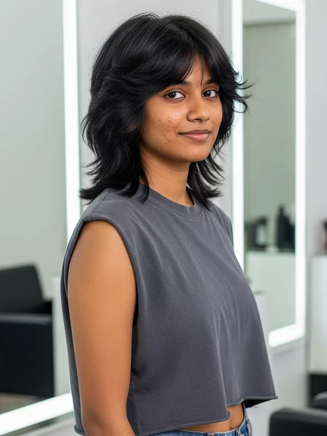 A bold fusion of mullet wolf cut, this hairstyle features sharp, disconnected layers for a rebellious feel. The black color amplifies the edginess, giving it true rocker appeal.