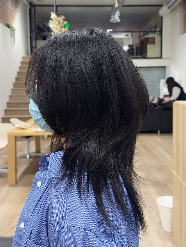 Polished and straight, this version of the black wolf haircut keeps the structure clean and smooth. The layers are subtle but effective, giving movement without frizz or bulk.