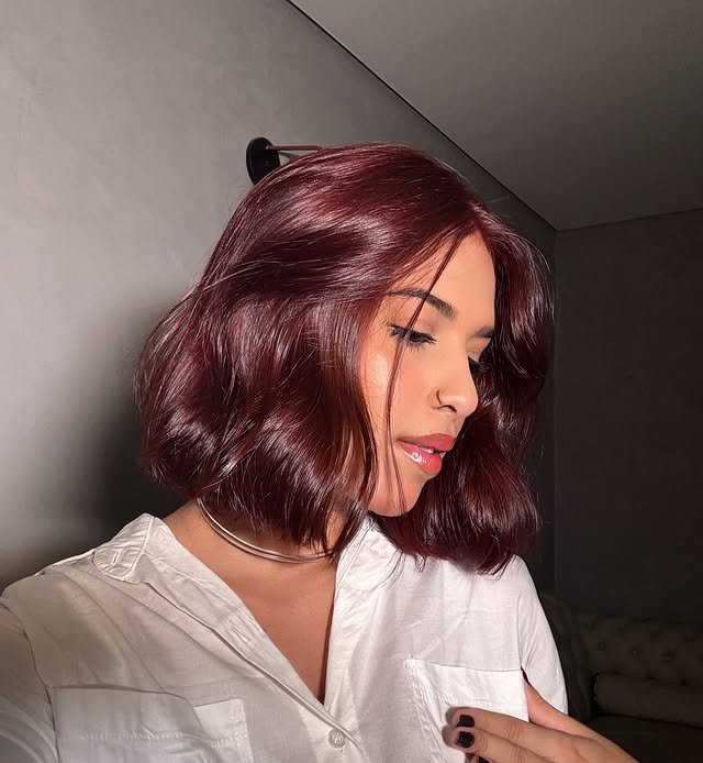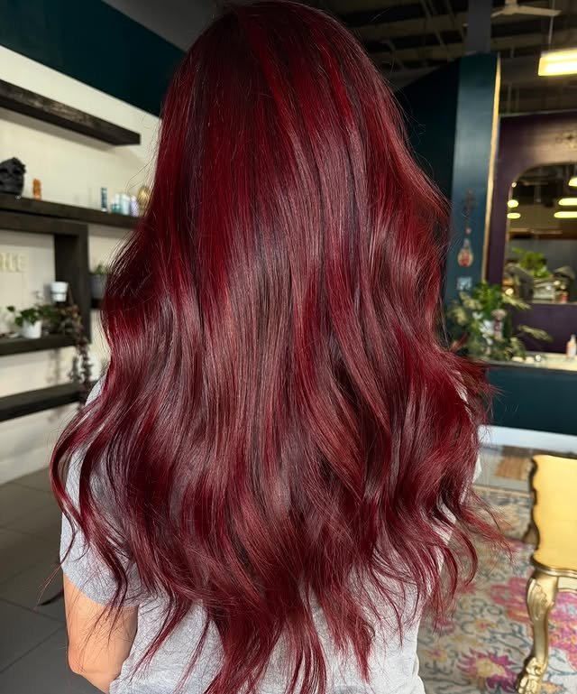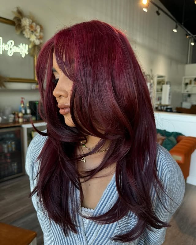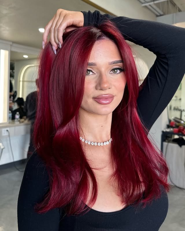 Glossy cherry red delivers a luxurious shine that feels polished and glamorous. This style adds richness and a healthy glow to your hair.