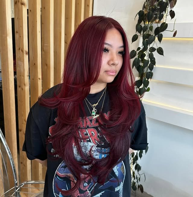 Layers with cherry red shades create movement and depth, making the hair look fuller. It’s the perfect way to showcase a vibrant color.