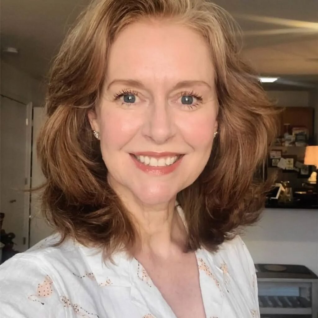 This hairstyle features soft, feathered layers that add body and movement to the hair. It’s perfect for women over 50 who want a flattering, low-maintenance cut that enhances natural texture and frames the face beautifully.