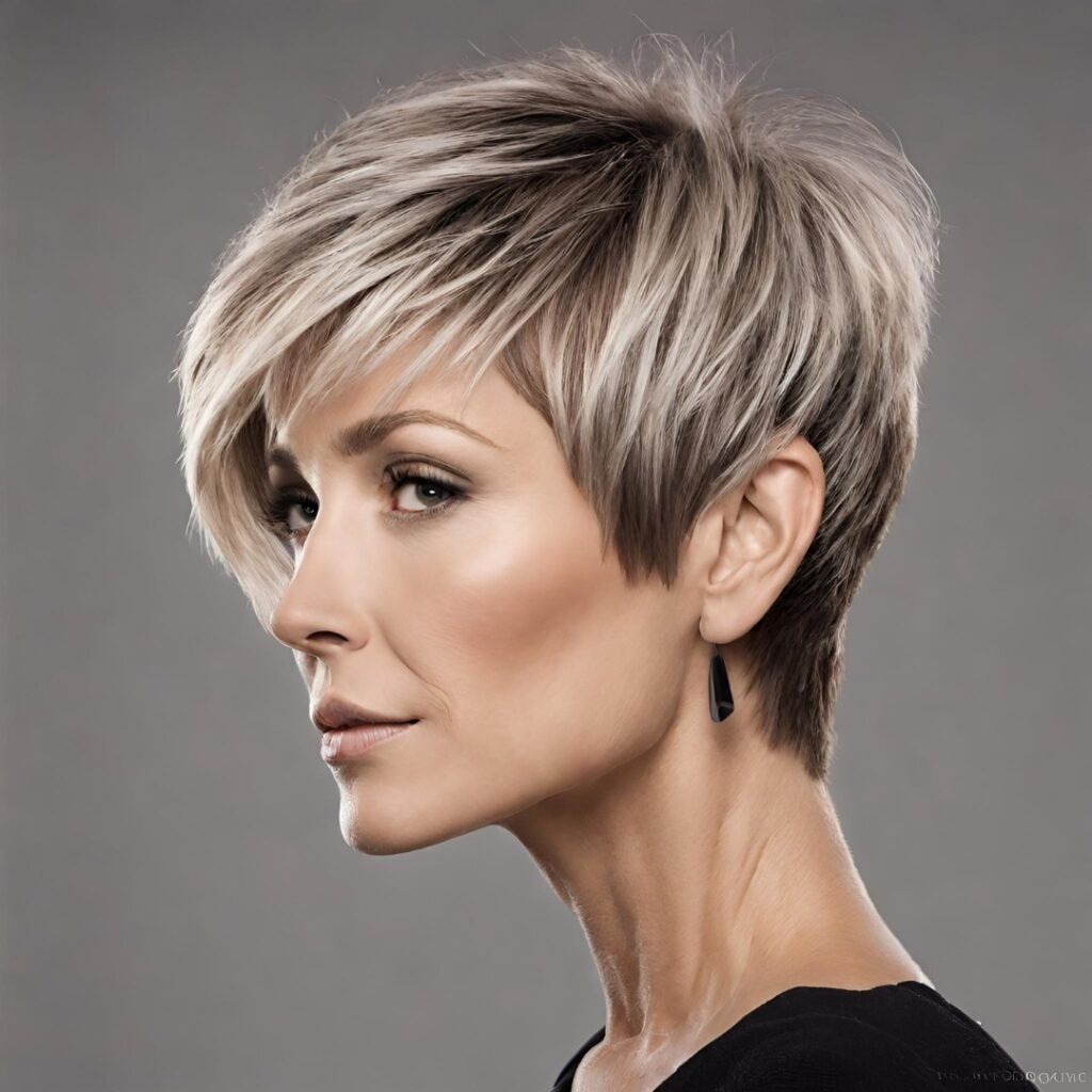 The textured pixie cut brings out strong cheekbones and gives an effortlessly stylish look with mid-length hair. This hairstyle is ideal for mature women who prefer a fresh, bold cut that’s easy to style every day.