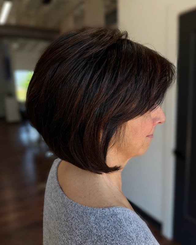 A tousled bob with side-swept bangs gives a soft, relaxed vibe that’s still full of style. It’s a flattering look for women over 50 who want something modern yet easygoing.