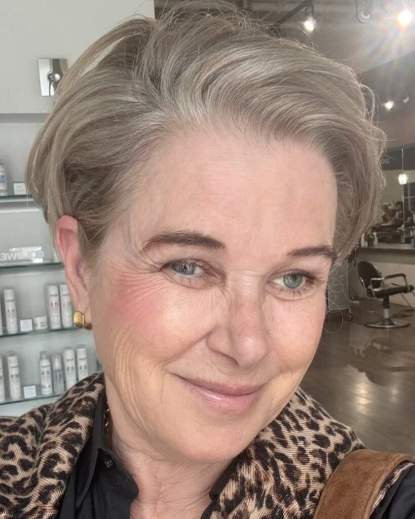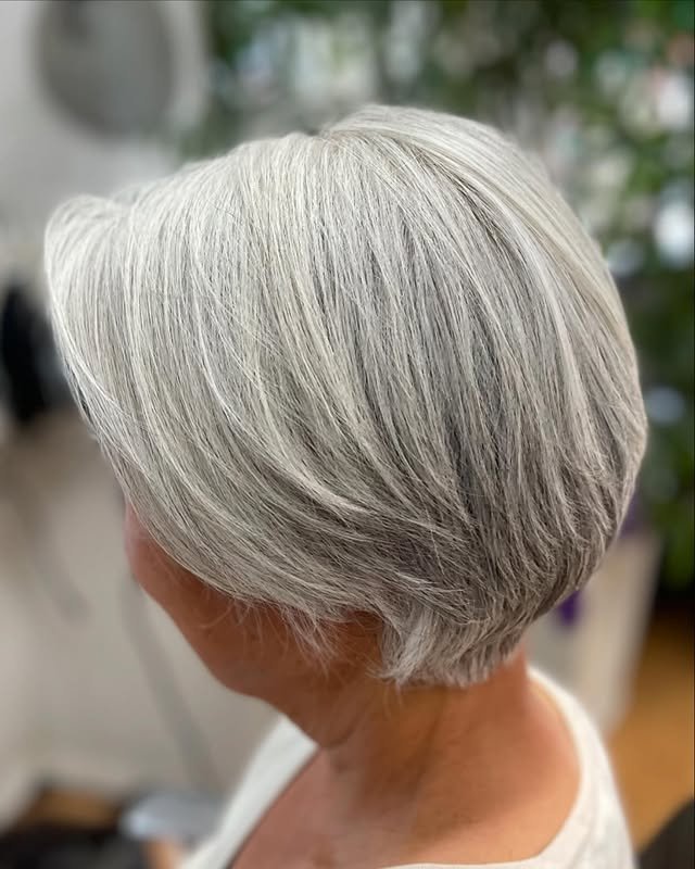 Celebrate your natural gray hair with a tapered pixie cut that’s both stylish and empowering. The short length brings out facial features and keeps styling simple and sleek.