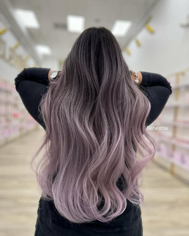 Transition from dark roots to a smoky lilac finish for a chic ombre effect that’s both stylish and low-maintenance.