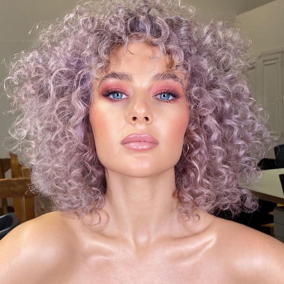 Enhance your natural curls with a soft lilac hue that adds depth and a playful twist with bob cut.