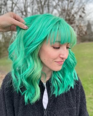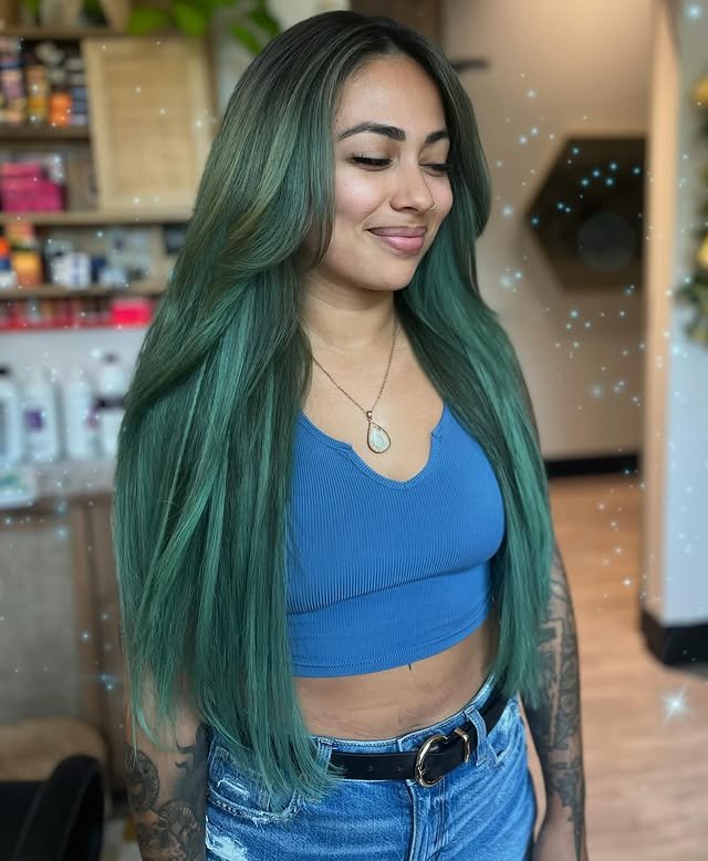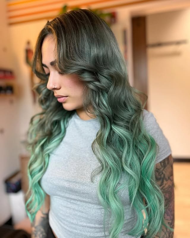 Channel mermaid vibes with cool mint tones and ocean-inspired blends. This style is pure fantasy brought to life with curtain bangs.