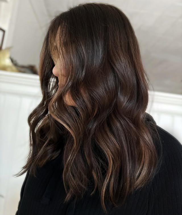 Balayage adds multi-tonal depth to your locks. Warm brunette highlights bring out your natural beauty with a radiant finish.