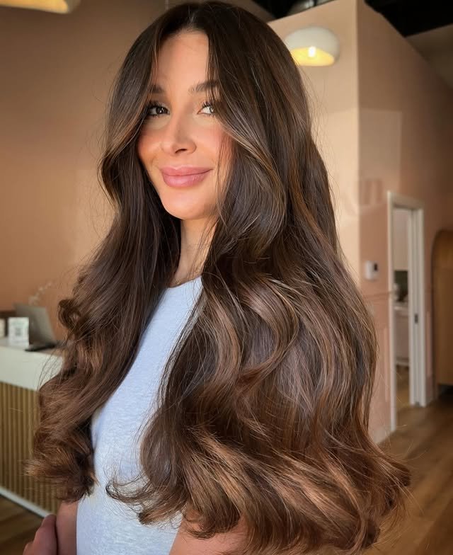 Soft highlights in warm tones make brown hair shine brighter. These balayage ideas are perfect for year-round glow.