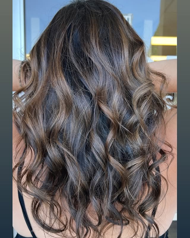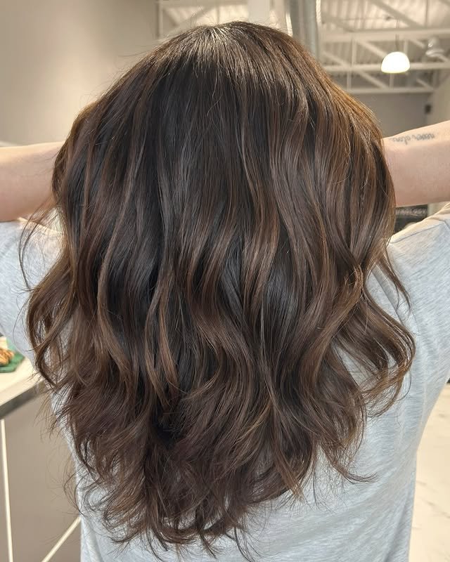 Waves in warm brunette shades create a soft, feminine finish. This style is perfect for a romantic, airy vibe.