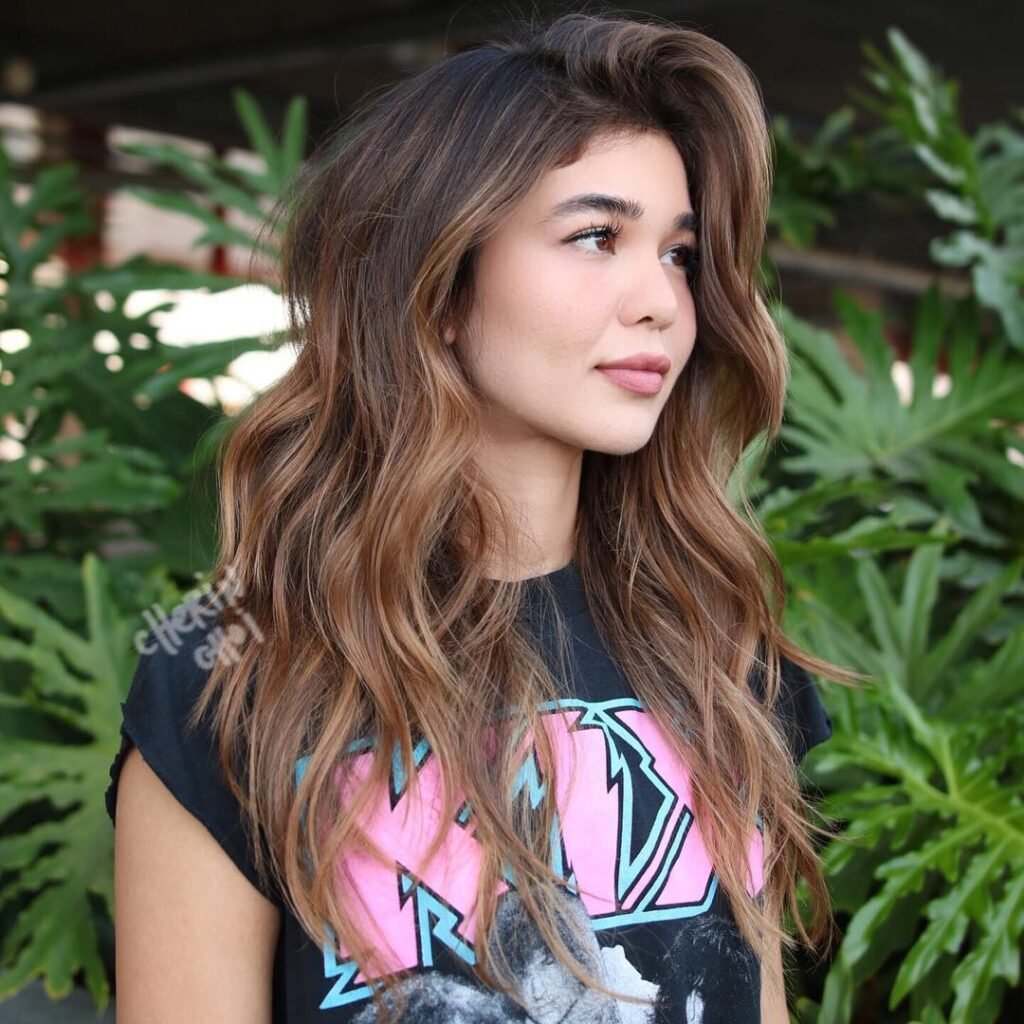 Honey highlights give warm brunette hair a sun-kissed look. It’s a fresh, luminous style for every season.