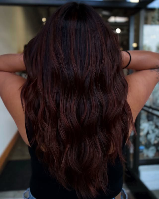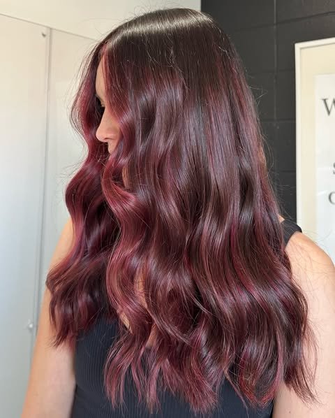 Add mystery and richness with deep red hues. These balayage ideas are moody and elegant with long hair.