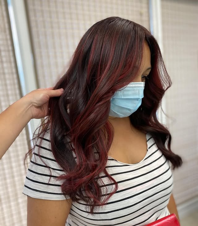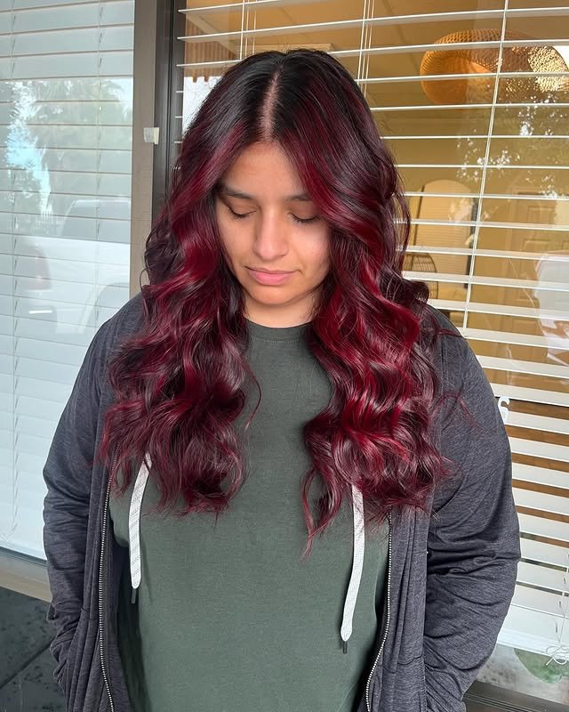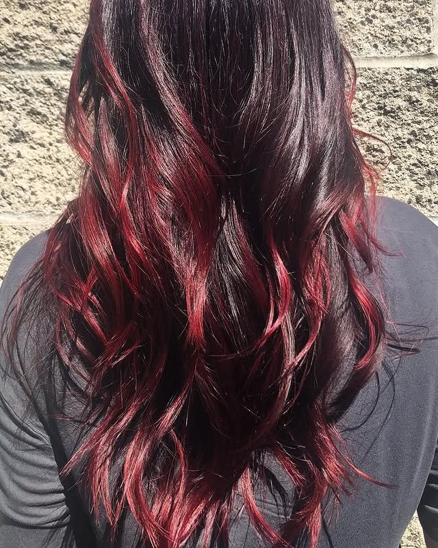 Add vibrant contrast to your dark base. Red balayage on brunettes creates stunning, warm depth.