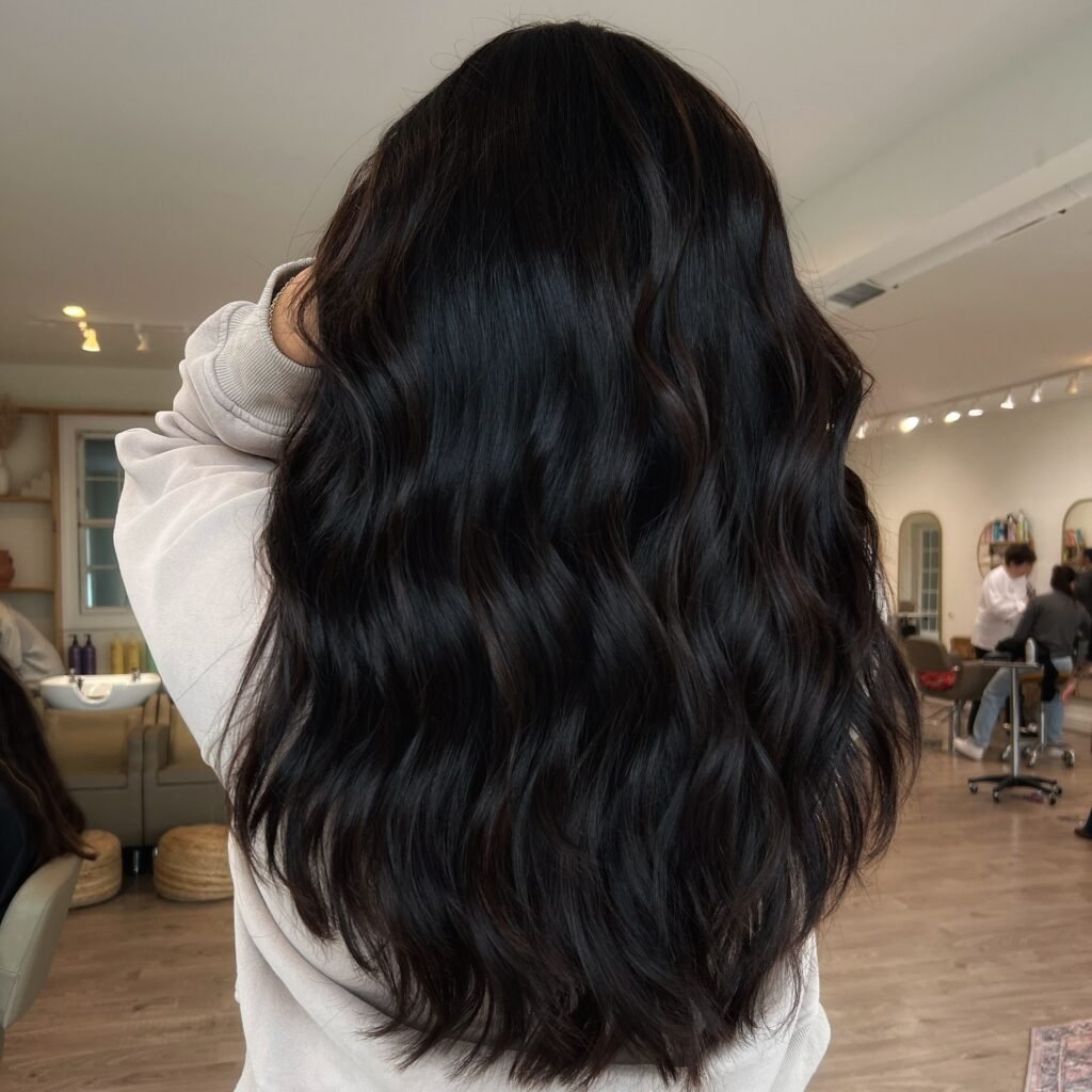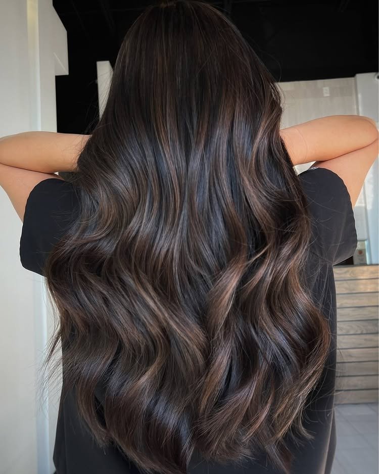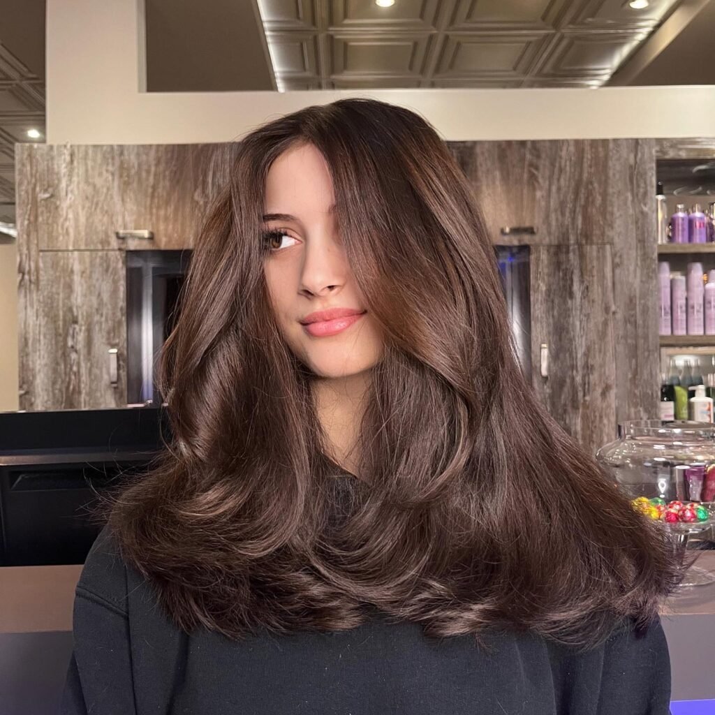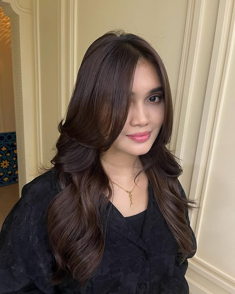 Long layers enhance the natural shine of dark brown tones, giving the hair a flowing, elegant finish.