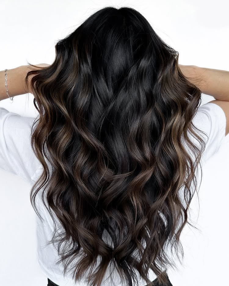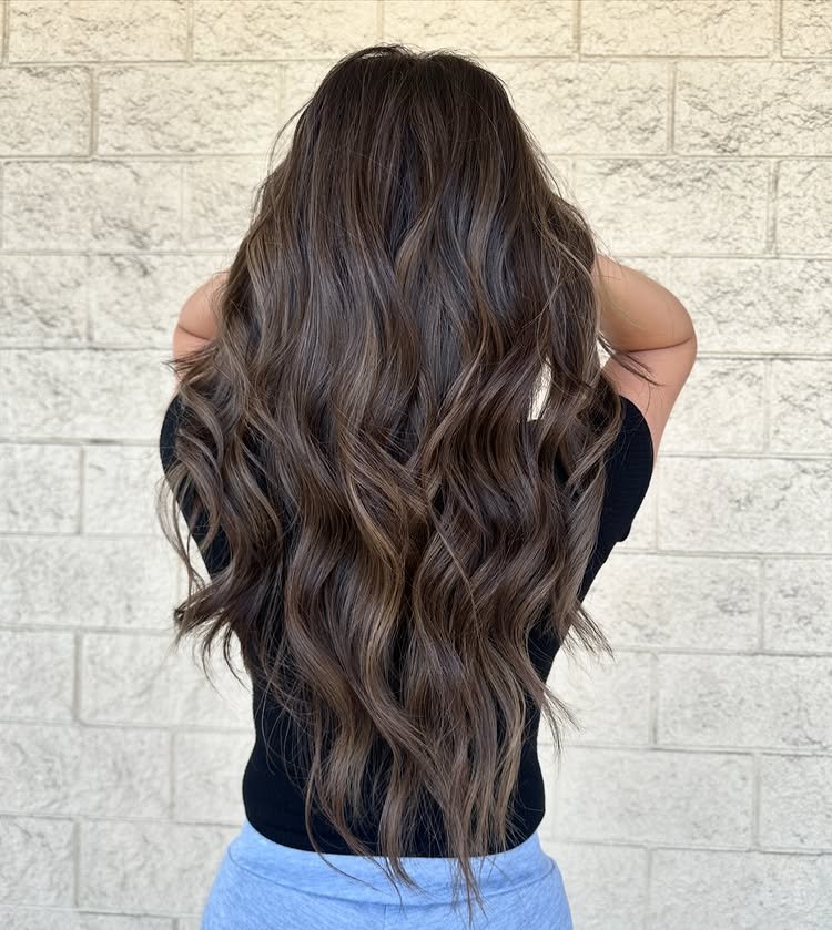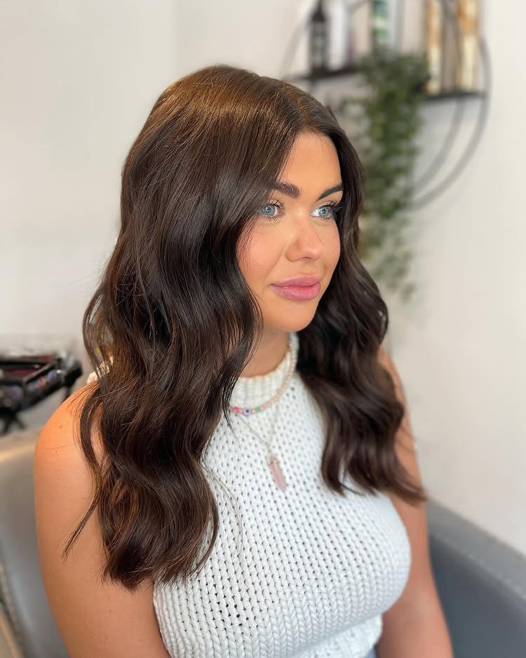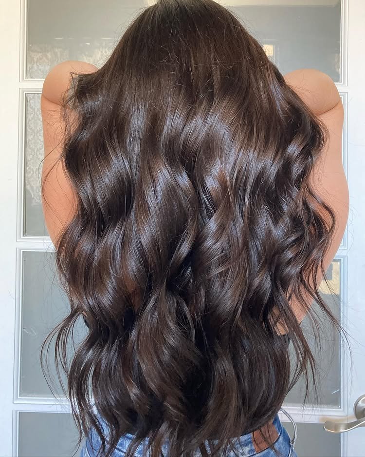 Gentle waves flow through dark brown strands, giving the haircut a relaxed, beachy vibe that’s effortlessly stylish.