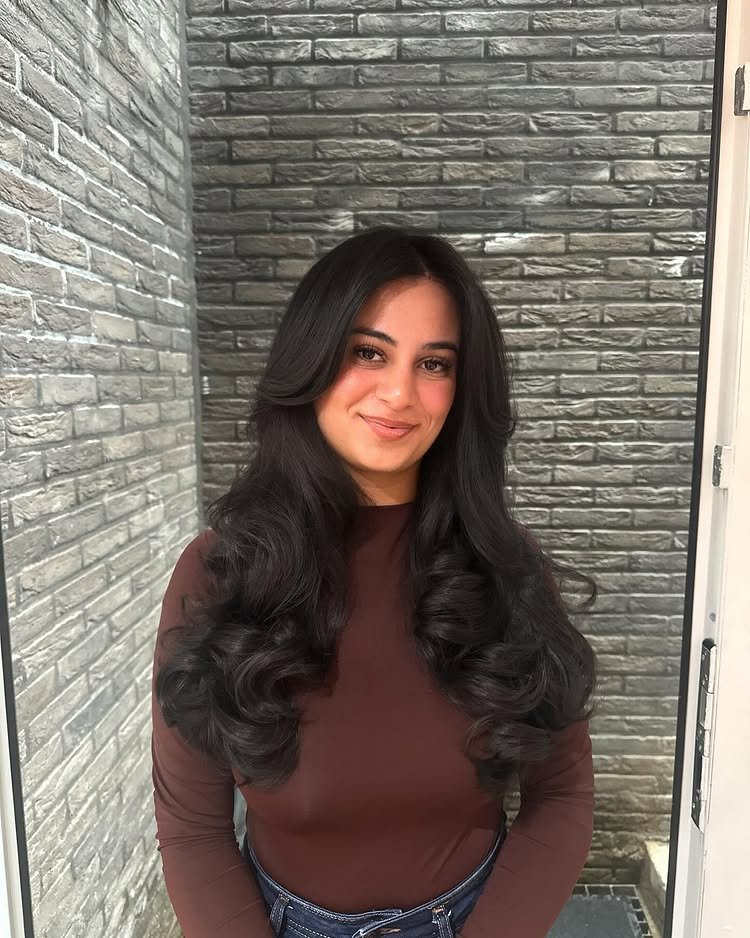 Feathered ends lighten up the dark brown tones, giving the hair a soft, airy movement that’s both chic and feminine.