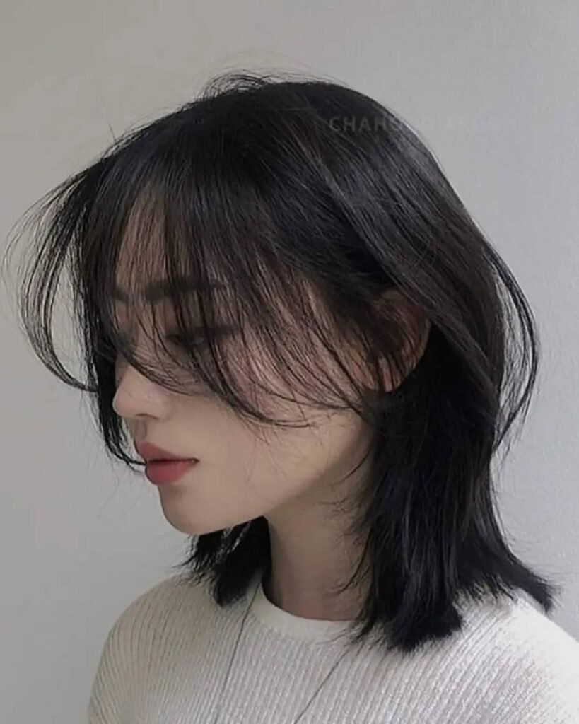 Feathered bangs blend into delicate, long layers, creating a dreamy and soft Korean wolf haircut. It’s ideal for date nights, photoshoots, or just feeling pretty every day.