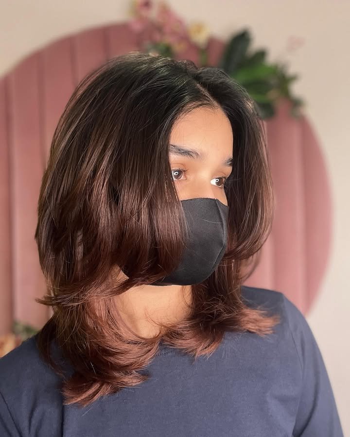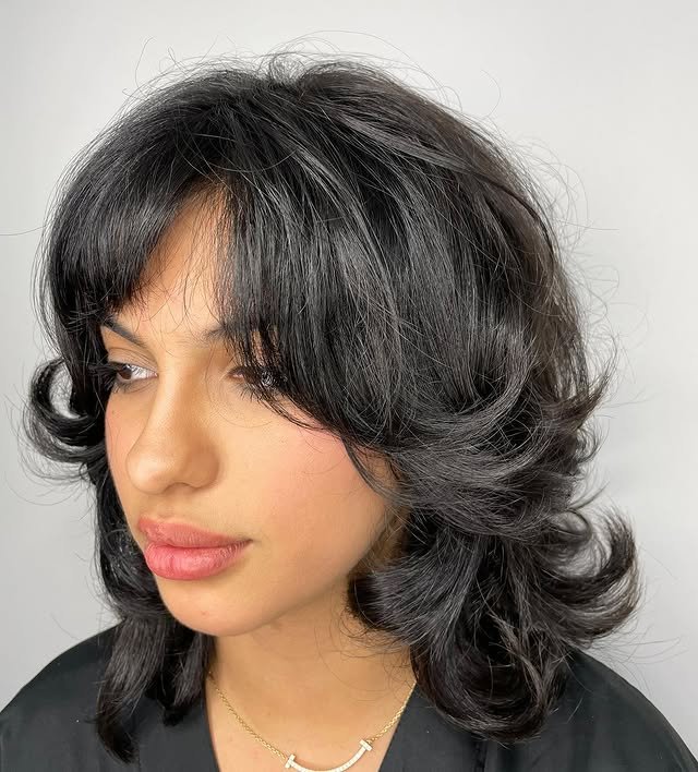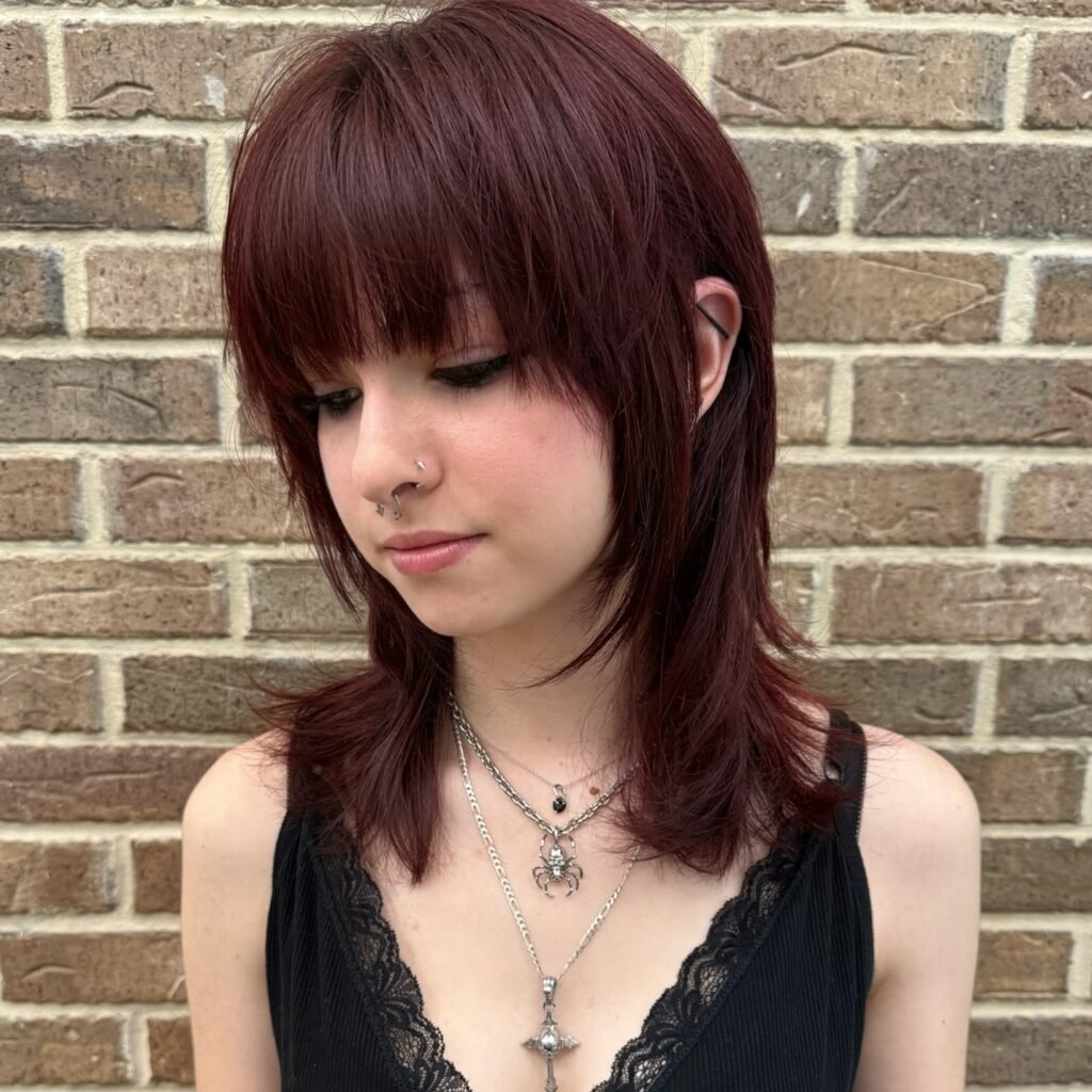 Rich auburn tones give warmth to this layered wolf hairstyle, and the subtle curtain bangs enhance the natural framing around the face. It’s sophisticated with a touch of wild.