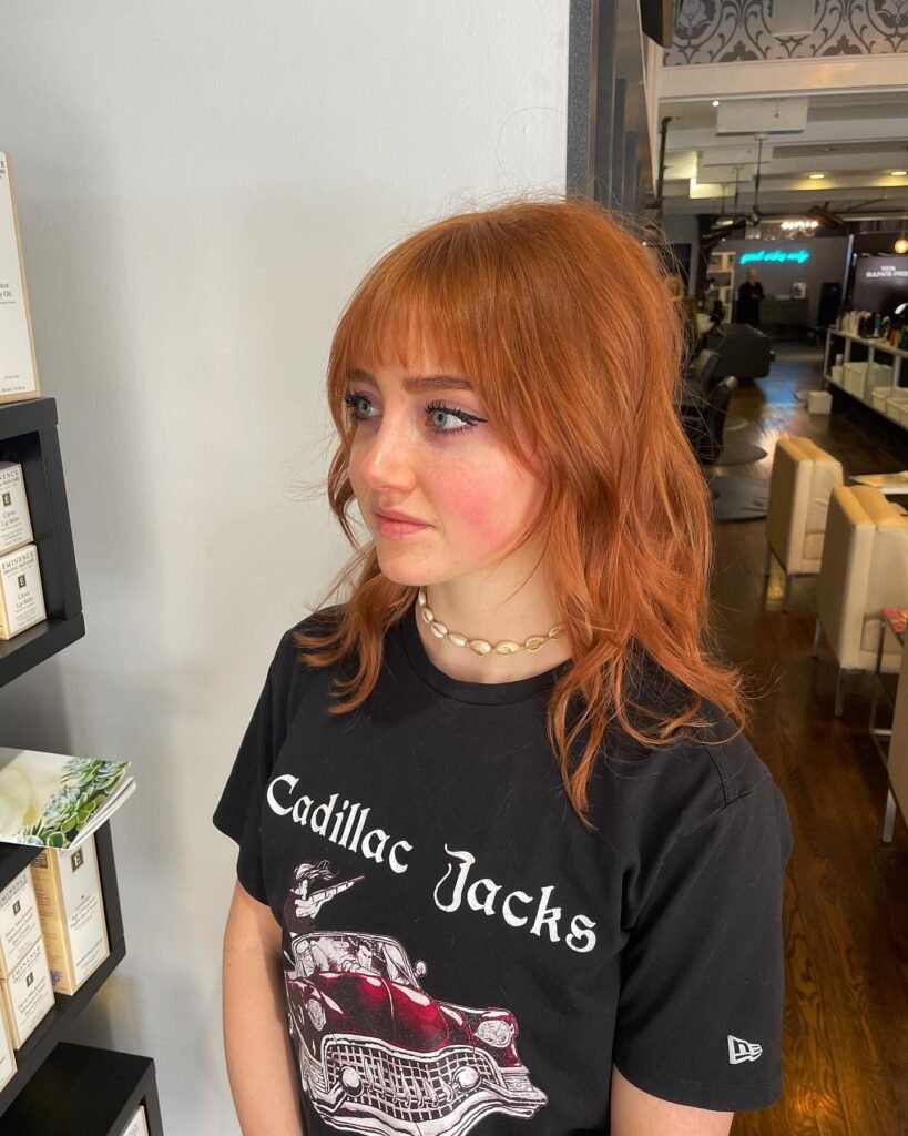 The warm copper color pairs beautifully with the soft flow of sweeping curtain bangs. This short wolf hairstyle feels rich and radiant while maintaining its edgy roots.