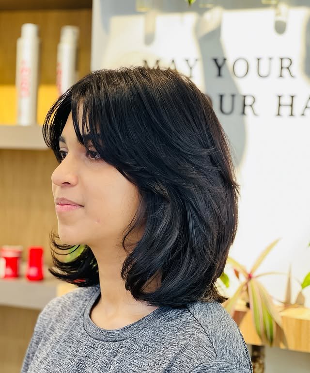 This hairstyle features expertly blended face-framing layers that enhance facial features, paired with soft curtain bangs. The result is a flattering, feminine take on the typically bold wolf haircut.