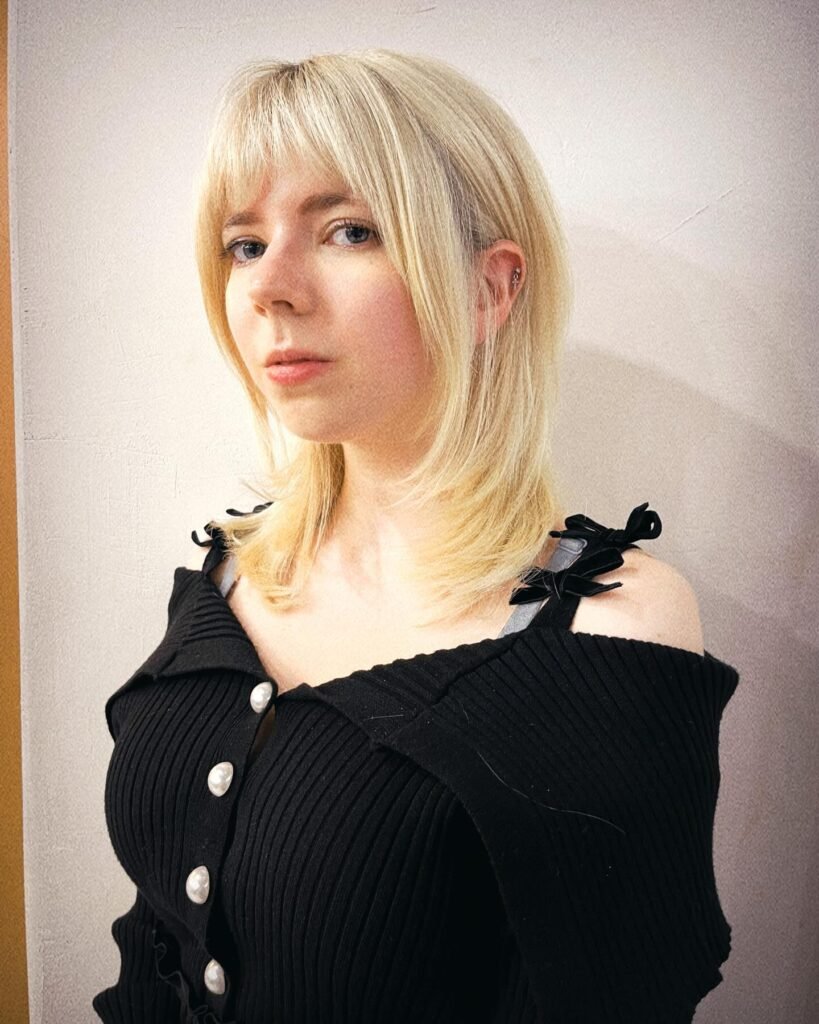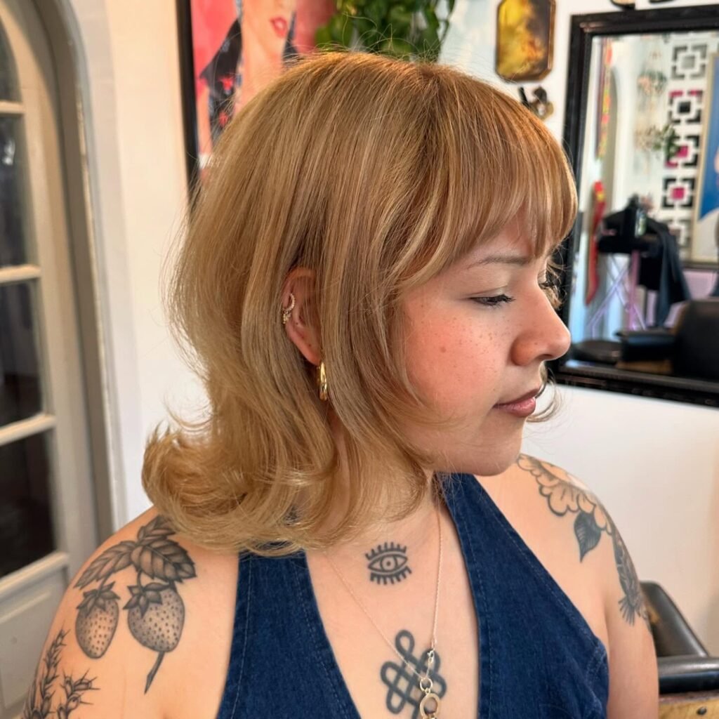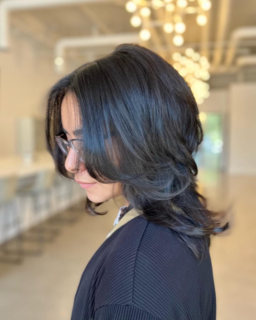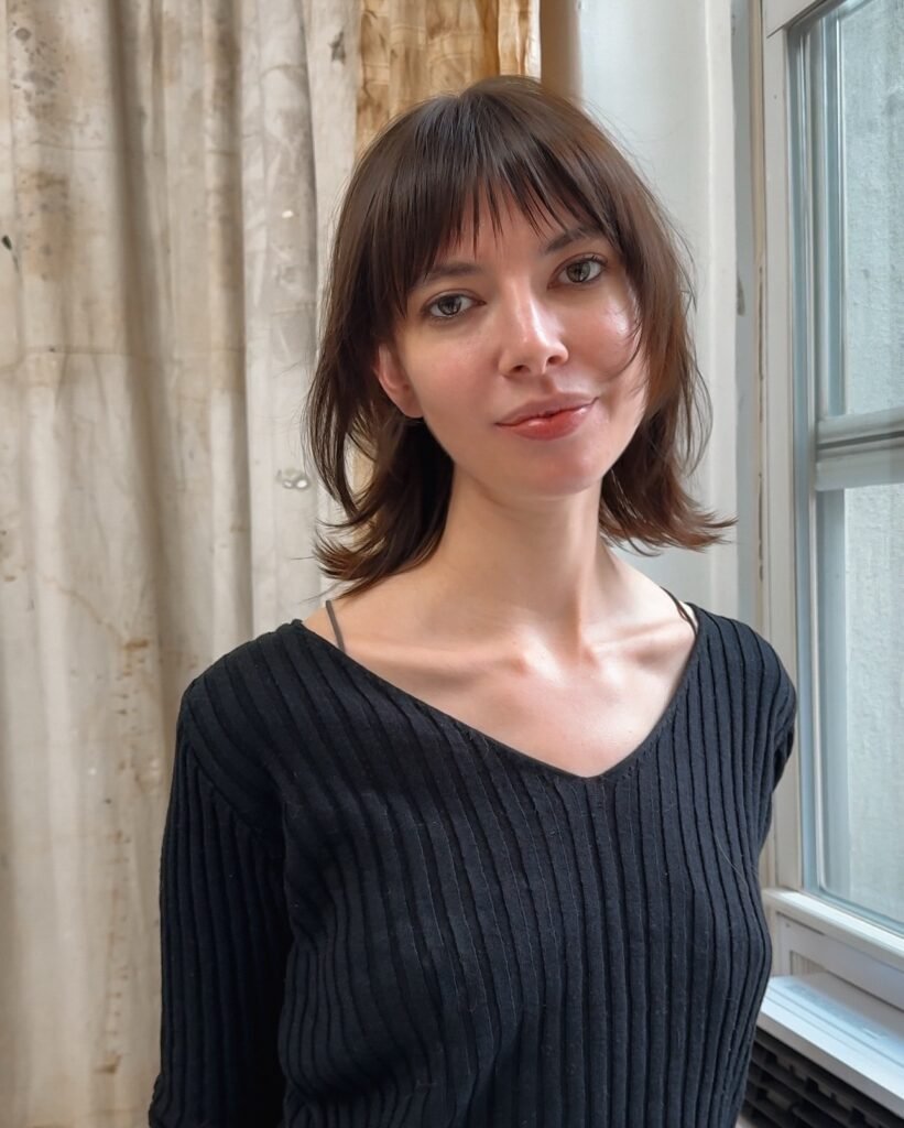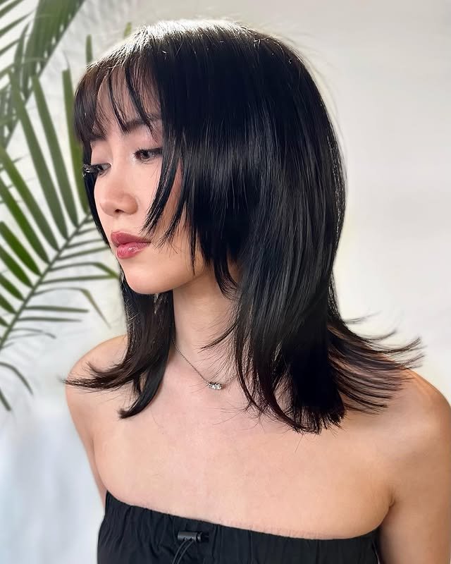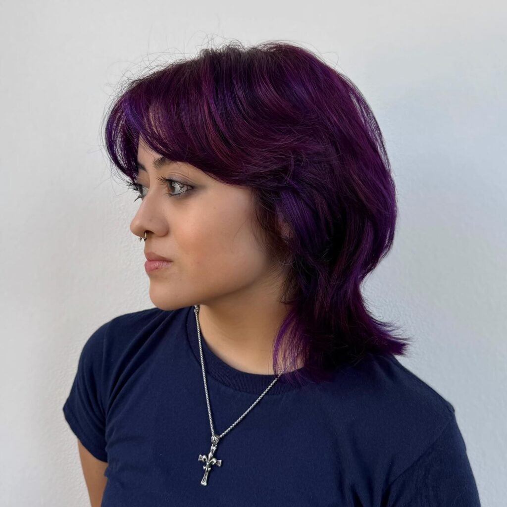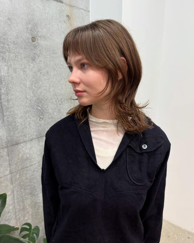 This look features a slightly blunt take on the wolf cut with smoother lines and sleek curtain bangs, creating a cleaner silhouette. It’s the perfect blend of structured and soft.