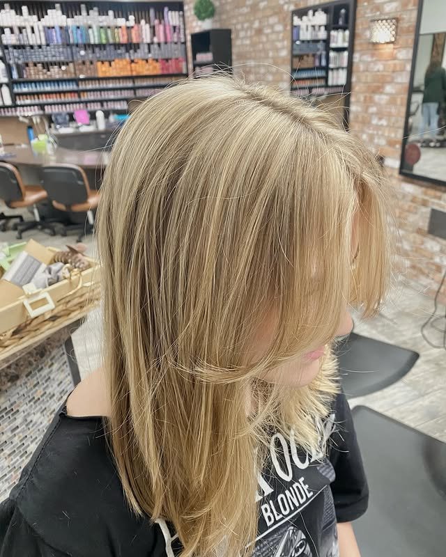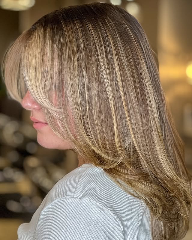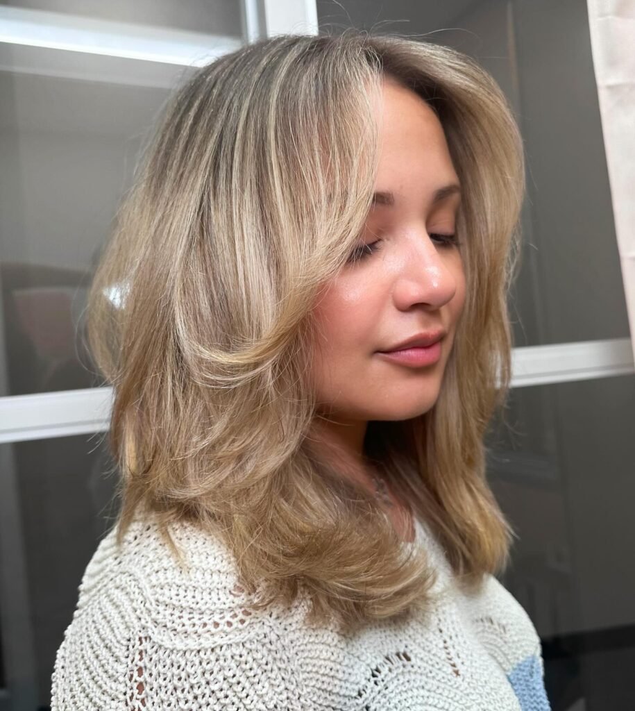Layered lengths enhance the face framing effect of curtain bangs. The blonde tones add depth and brightness, making this haircut both chic and easy to manage.