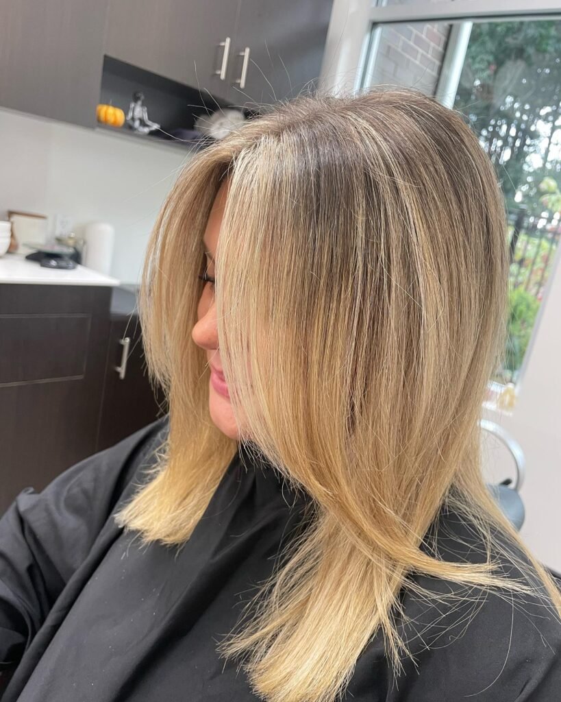 This style blends natural roots with blonde balayage and curtain bangs, delivering a sun-kissed effect that’s perfect for low-maintenance beauty lovers.