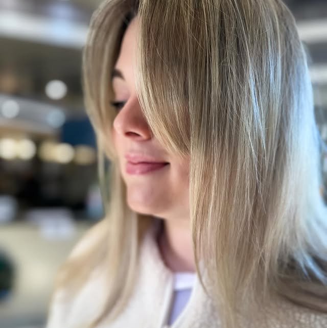 This beige blonde hair color with blended curtain bangs brings natural elegance. It’s an ideal shade for softening the overall look.
