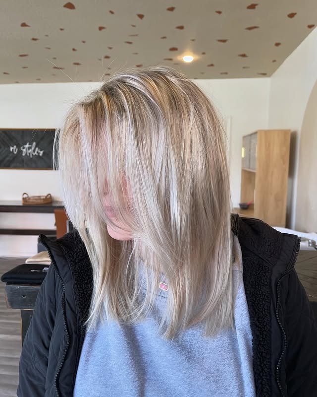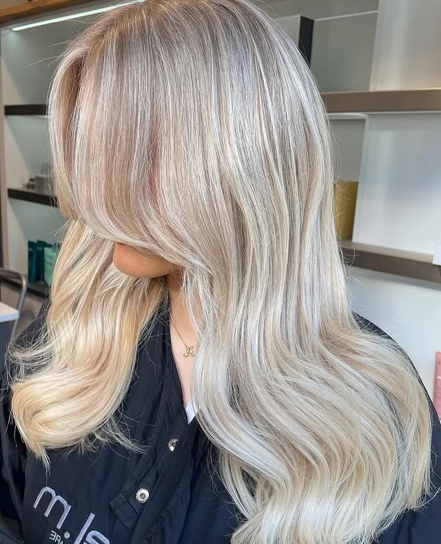 Cool-toned ash blonde hair with soft curtain bangs creates a sleek, editorial look. This style suits modern minimalists who want subtle sophistication.