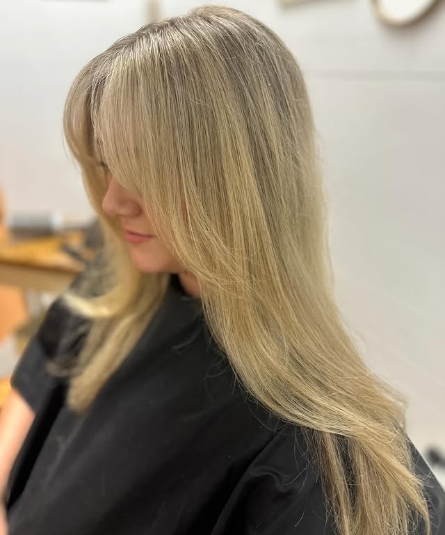 Long hair, flowing hair with curtain bangs offers a boho-inspired charm. The blonde color amplifies the softness of this style, perfect for creating a dreamy, effortless appearance.