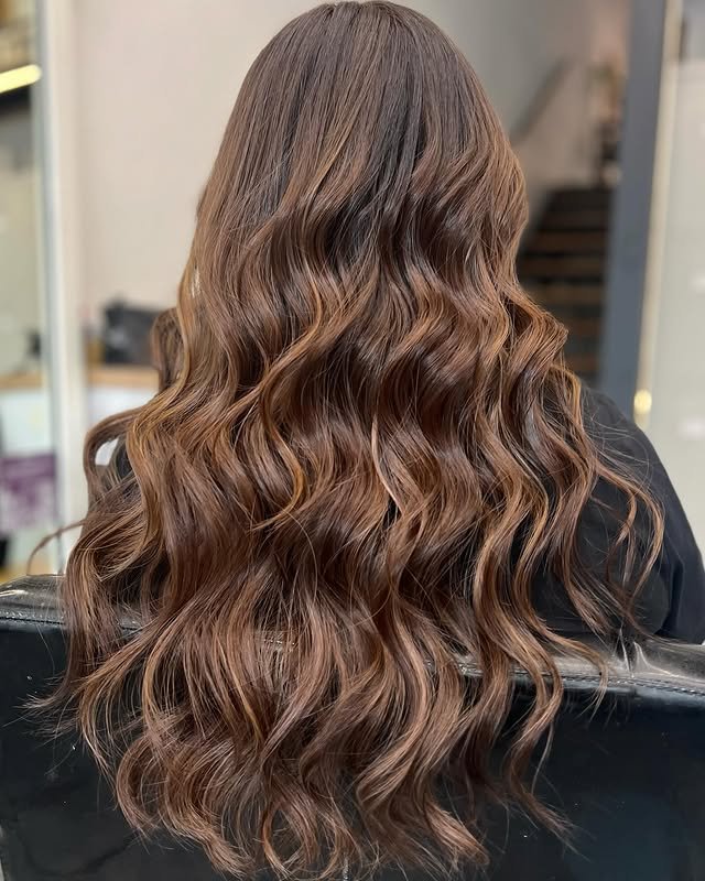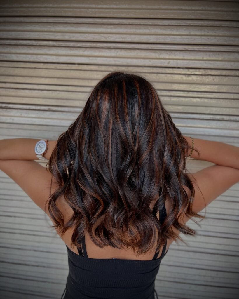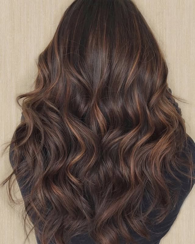 Mahogany brown hair with caramel highlights results in a rich, reddish glow. The warm contrast enhances curls or waves and adds depth to every strand.