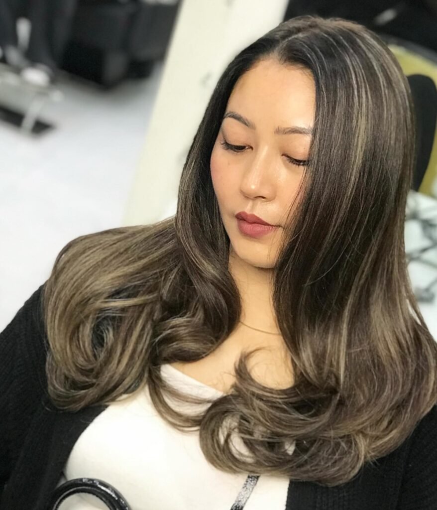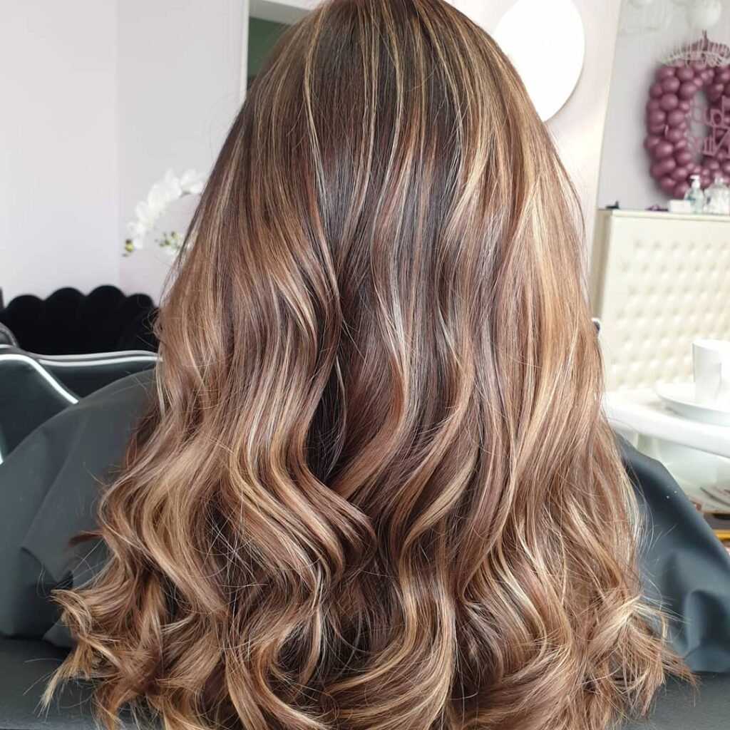 Soft waves combined with scattered caramel streaks bring this long hair to life. The combination adds movement, warmth, and a beachy, effortless feel to the overall look.