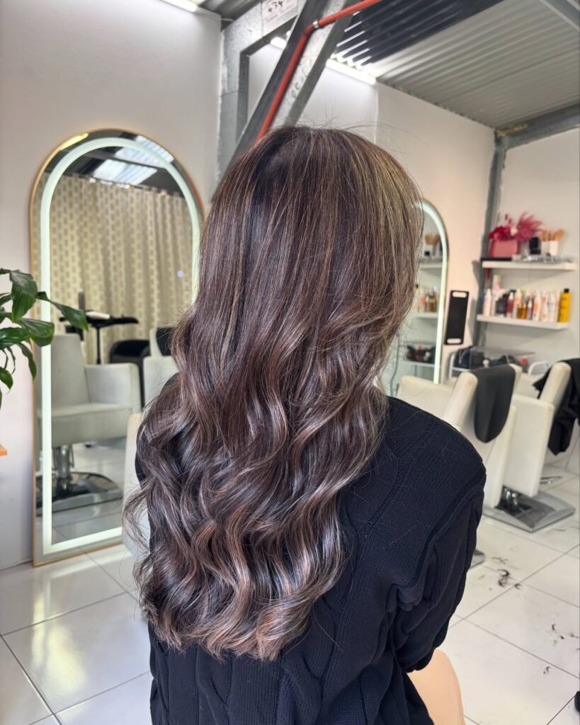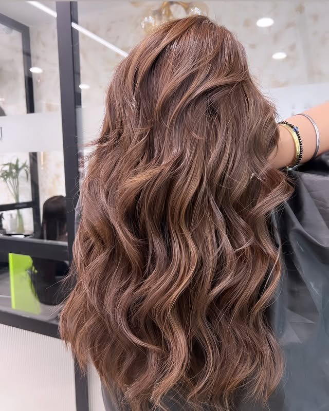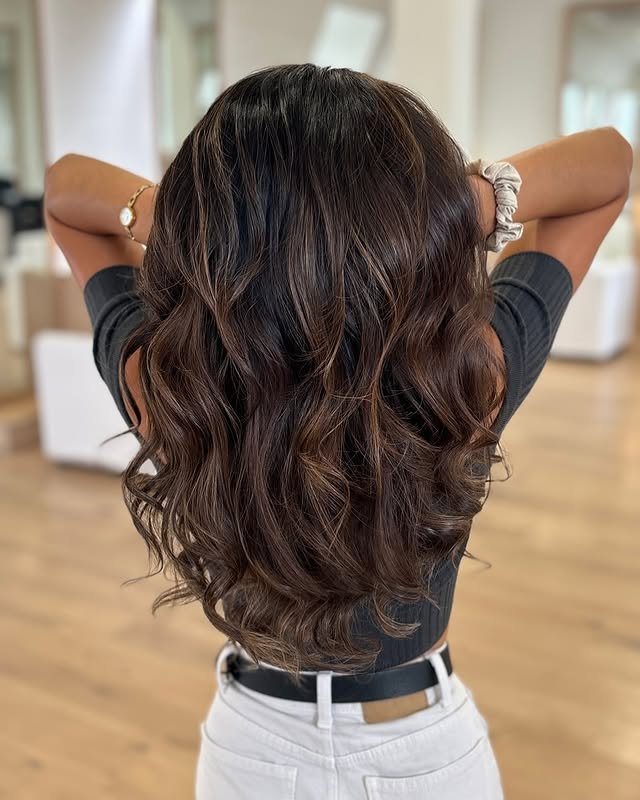 This luxe brunette look features hand-painted caramel balayage throughout the lengths, creating a natural, radiant glow. It’s effortlessly chic and full of dimension.