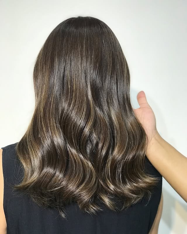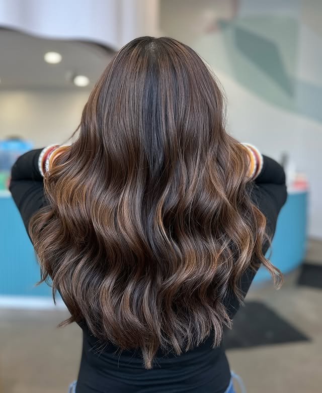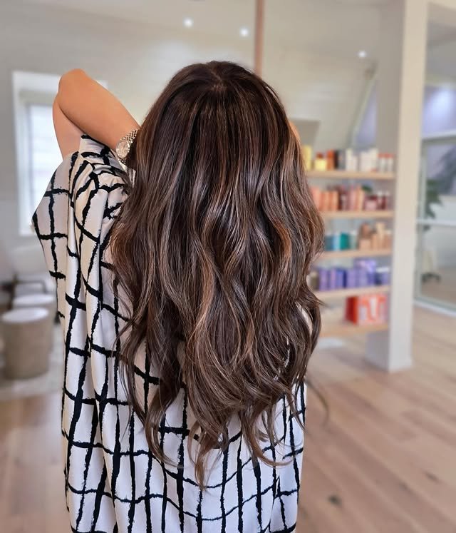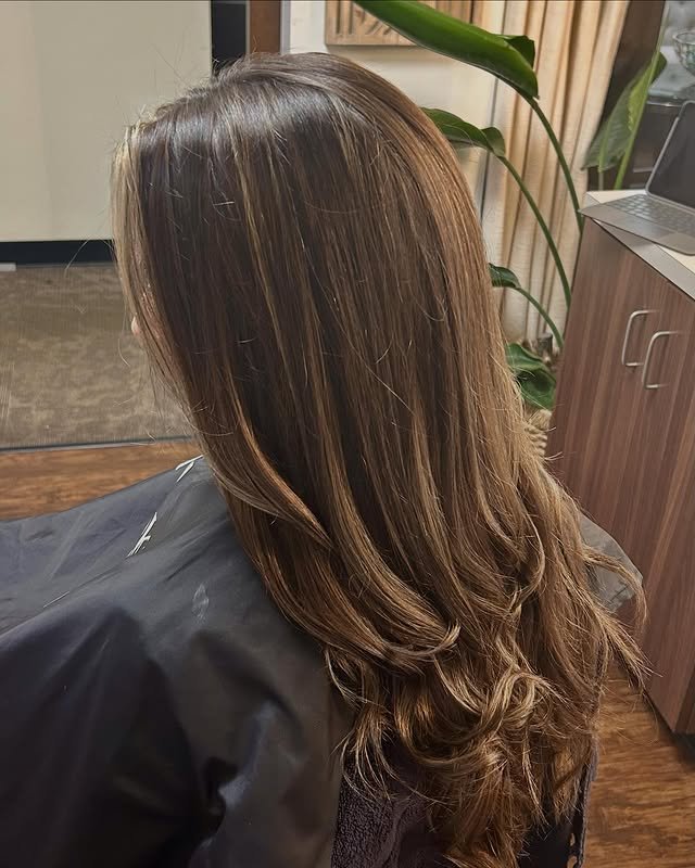 This style features soft caramel highlights gently woven through rich brown hair, creating a natural, sunlit glow. The warm tones bring out the depth and dimension, perfect for a subtle refresh.