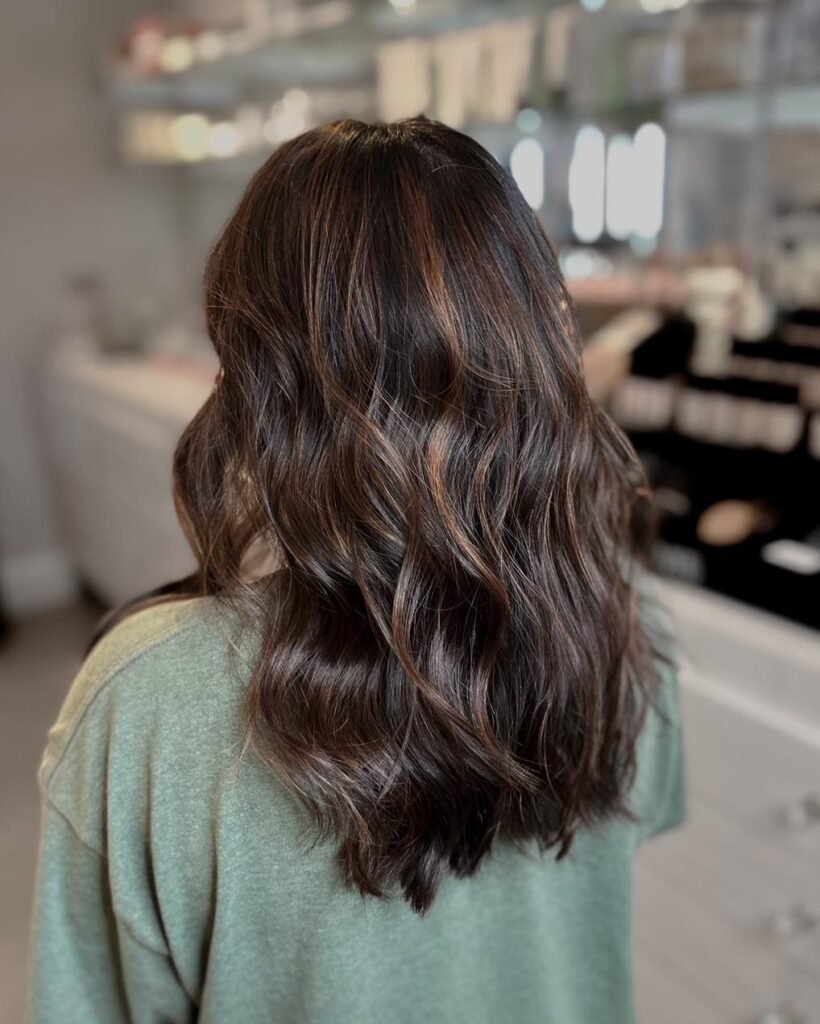 The richness of deep espresso brown hair is elevated with thin caramel ribbons. This color placement creates contrast and visual interest while maintaining a sophisticated look.