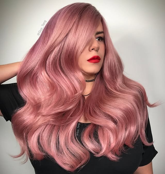 Big, voluminous curls meet a soft dusty rose tone in this glamorous hairstyle. The combination of curl and color gives the look life and bounce, perfect for those who want to turn heads with a bold yet graceful statement.