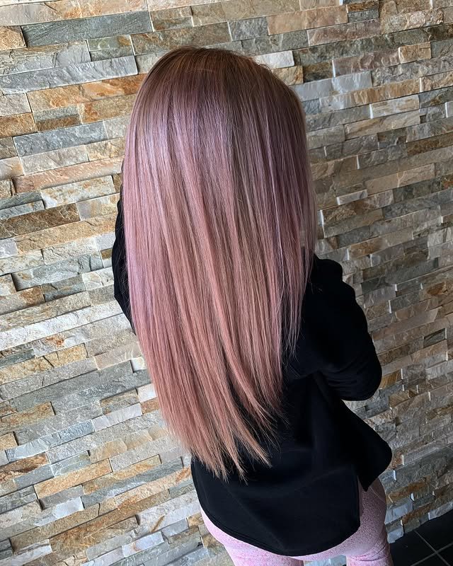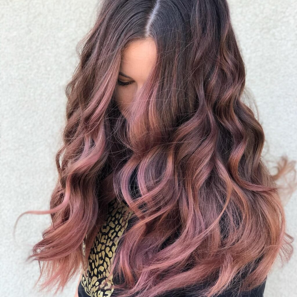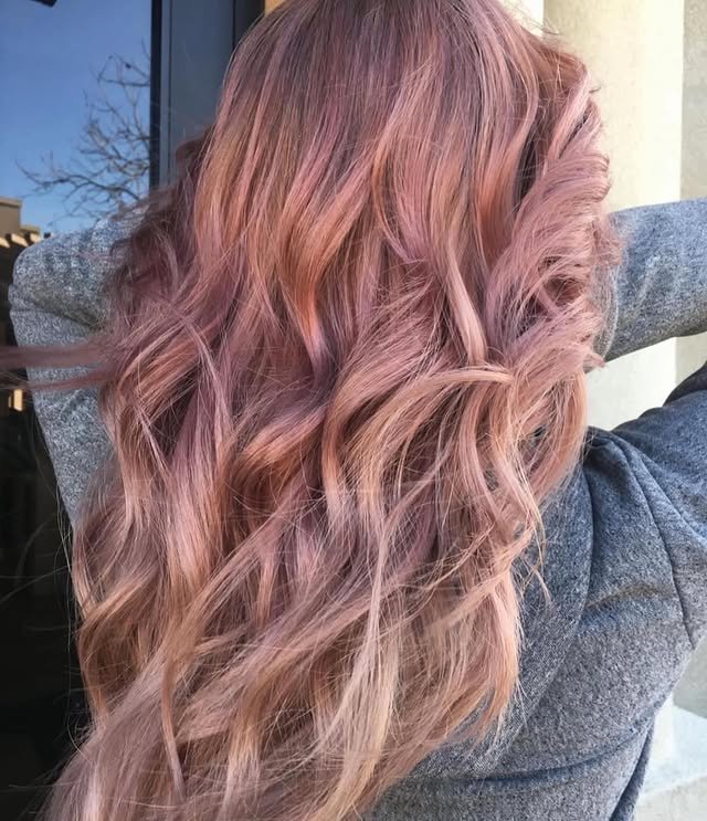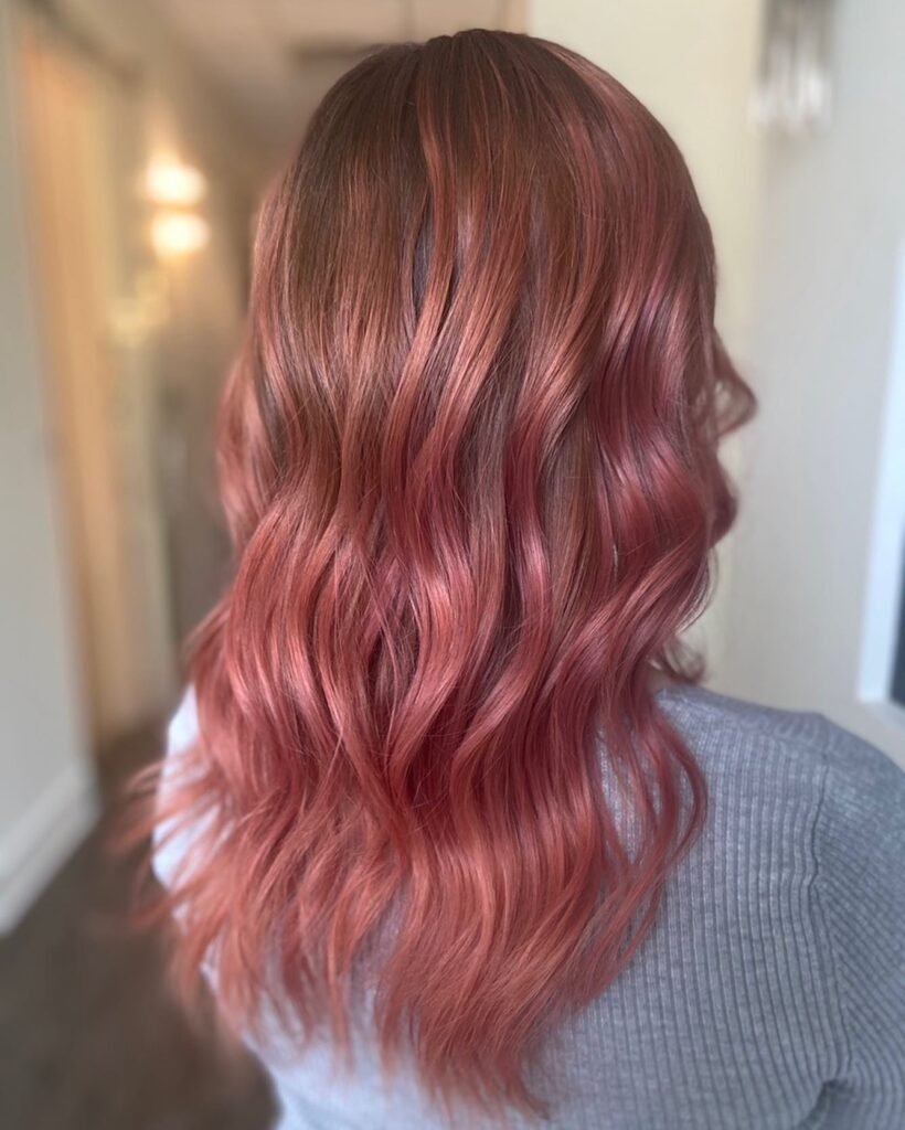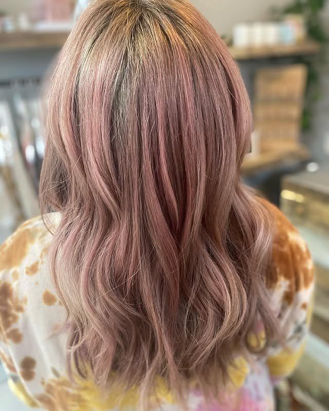 This hairstyle blends dusty rose tones into a soft balayage, creating a graceful transition from natural roots to pastel ends. The look is dimensional and soft, adding movement and depth to the overall style.